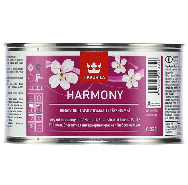 Краска интерьерная Tikkurila Harmony - бархатисто-матовая акрилатная латексная краска, стойкая к очистке. Предназначена для интерьерной окраски новых и ранее окрашенных оштукатуренных, бетонных, зашпатлеванных, кирпичных, картонных, деревянных и гипсокартонных поверхностей, а также древесностружечных и древесноволокнистых плит внутри помещений. Не подходит для окраски дверей и мебели. Применяется для окраски стен в гостиных, детских комнатах, спальнях и других сухих помещениях. Также может применяться для потолков в сухих помещениях. Окрашиваемая поверхность должна быть сухой. Температура воздуха должна быть не ниже +5 ºС, и относительная влажность воздуха не выше 80 %. Наносится кистью, распылением или валиком. При нанесении безвоздушным распылением применять сопло 0,017"–0,021". Расход: на впитывающую поверхность – 7–9 м²/л, на невпитывающую поверхность – 10–12 м²/л. 2 класс по ISO 11998, выдерживает легкую влажную уборку. Преимущества интерьерной краски Tikkurila Harmony: Интерьерная краска Гармония создает мягкую бархатистую поверхность, к которой так и хочется прикоснуться. Ее можно использовать при создании как минималистичных, так и богато декорированных интерьеров, ведь бархат – излюбленный материал королей и богемы. Гармония от Тиккурила относится к высшему классу эмиссии строительных материалов М1. Такие материалы практически не выделяют вредных веществ. Выбрав ее для окраски детской комнаты, вы можете не опасаться за здоровье малыша. Интерьерную краску Гармония можно использовать для оштукатуренных, бетонных, зашпатлеванных, кирпичных, картонных, деревянных и гипсокартонных поверхностей. Она стойка к мытью, а глубокоматовый оттенок хорошо скроет мелкие недостатки поверхности. Бархатистый эффект Гармонии вдохновляет на эксперименты с текстурой. Стильный интерьер можно создать, просто нанеся на окрашенную ею поверхность рисунок глянцевым бесцветным лаком или полуглянцевой краской того же цвета.