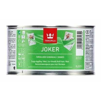 Краска интерьерная Tikkurila Joker - обладающая хорошей стойкостью к очистке акрилатная краска, не содержащая органических растворителей и обладающая шелковистым эффектом. Краске присвоен "Экознак" Европейского Союза и она разработана в результате сотрудничества с Ассоциацией по аллергическим и астматическим заболеваниям Финляндии.Предназначена для окраски оштукатуренных, бетонных, зашпатлеванных, кирпичных, картонных, деревянных поверхностей, гипсовых, древесноволокнистых и древесностружечных плит внутри помещения. Применима как на новые, так и на ранее окрашенные поверхности. Не подходит для окраски дверей и мебели. Применяется для окраски стен в гостиных, спальнях, детских комнатах, передних, на кухнях и т.п. сухих помещениях. Также может применяться для потолков в сухих помещениях. Колеруется согласно гамме «Тиккурила Симфония». База С может быть использована только в заколерованном виде. Окрашиваемая поверхность должна быть сухой. Температура воздуха должна быть не ниже +5ºС и относительная влажность воздуха – не выше 80 %. Наносится кистью, распылением или валиком. При распылении под высоким давлением применять сопло 0,015"- 0,021". Допускается разбавление до 10 % по объему. Расход: на впитывающую поверхность: 7–9 м²/л, на невпитывающую поверхность: 10–12 м²/л. Преимущества интерьерной краски Tikkurila Joker: Интерьерная краска Джокер разработана совместно с финской Ассоциацией по аллергическим и астматическим заболеваниям. Ее безопасность для здоровья подтверждена «Экознаком» Европейского Союза. Краска устойчива к влажной очистке и станет идеальным выбором для детской. Джокер – одна из самых популярных красок Тиккурила и пользуется заслуженной любовью потребителей вот уже более 60 лет. Краска образует красивую матовую поверхность с шелковистым эффектом. Она быстро высыхает, все же оставляя достаточно времени на обработку поверхности без опасения появления «швов». Более 20 000 оттенков доступны в палитре для колеровки краски Джокер.