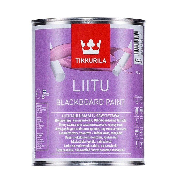 Tikkurila Liitu - новая колеруемая краска для школьных досок. Результат окраски - матовая поверхность любого цвета, на которую хорошо ложится мел. Краска подойдет для окраски не только школьных досок, но и для стен, дверей, барных досок и даже столиков в детской комнате. Краска Tikkurila Liitu экологична, она разбавляется водой и практически не имеет запаха. Наносится при помощи валика с коротким ворсом, кистью или распылением в 1-2 слоя. Окрашиваемая поверхность должна быть сухой, температура воздуха – минимум +8 C, относительная влажность воздуха – 80 %. После окраски с поверхностью следует обращаться аккуратно в течение нескольких недель, так как покрытие достигает конечной твердости в обычных условиях спустя 1 месяц.