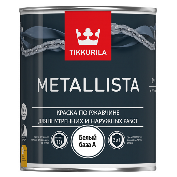 Краска по ржавчине Tikkurila Metallista база A - специальная атмосферостойкая краска по ржавчине, которая сочетает в себе свойства преобразователя ржавчины, антикоррозионной грунтовки и декоративного финишного покрытия. Позволяет легко проводить окраску металлических поверхностей без тщательной очистки от ржавчины и дополнительного использования грунтовки. Воск в составе материала создает барьер и защищает от проникновения влаги к металлу. Антикоррозионные компоненты краски взаимодействуют со ржавчиной и не дают ей распространяться дальше, надежно защищая металлическую поверхность на длительный срок. Применение: База «А» также может использоваться в качестве белой краски. Колеруется по всем каталогам внутренней и наружной окраски. Походит для окраски стальных и чугунных поверхностей с остатками плотно держащейся ржавчины, эксплуатируемых в атмосферных условиях (металлические конструкции, садовая мебель, гаражи, ограды, решетки и т.д.), и внутри помещений. Возможно применение в детских дошкольных учреждениях и помещениях административной группы, лечебно-профилактических учреждениях. Преимущества краски по ржавчине Tikkurila Metallista: Уникальная формула 3 в 1. Можно наносить прямо на ржавую поверхность, отличная укрывистость и адгезия. Бескомпромиссная защита металла. Краска Metallista – это эффективное решение для защиты металлических поверхностей до 10 лет. Теперь вам не придется идти на компромисс, с Metallista вы можете быть уверены, что получите максимум. Атмосферостойкая усиленная воском формула. Воск в составе краски Metallista препятствует проникновению влаги и грязи к основанию, а активные компоненты взаимодействуют со ржавчиной и не дают ей распространяться дальше, образуя нерастворимый защитный слой. Трехступенчатая система защиты металла. Простое решение для сложных поверхностей? Краска Metallista – это преобразователь ржавчины, антикоррозионная грунтовка и декоративное покрытие в одной банке. Теперь окрашивать металлические поверхности можно без дополнительной подготовки! Обратите внимание! Со свежеокрашенной поверхностью следует обращаться осторожно в течение нескольких недель, т.к. при нормальных условиях покрытие достигает своей окончательной твердости только через месяц. В случае, если придется очищать поверхность ранее этого срока, рекомендуется легкая очистка мягкой влажной тканью, избегая натирания. При необходимости, не ранее, чем через месяц после окраски, поверхность можно очистить нейтральным моющим раствором (pH 6–8) с помощью мягкой влажной ткани или щетки. Особенно загрязненные поверхности вымыть слабым щелочным раствором (pH 8–10). Придерживаться инструкций производителя по приготовлению раствора. После очистки поверхность промыть водой и оставить высохнуть.