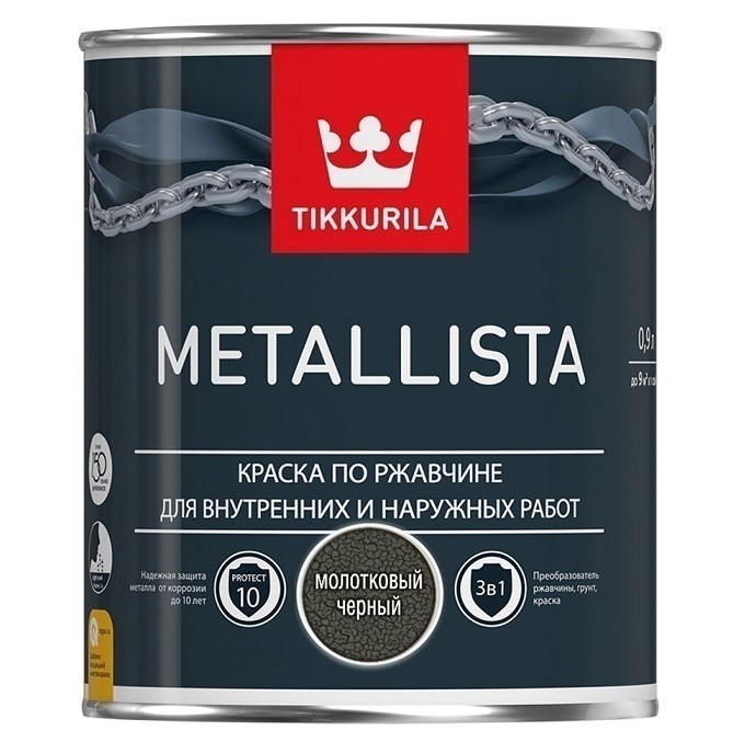 Краска по ржавчине Tikkurila Metallista глянцевая молотковая черная - специальная атмосферостойкая краска по ржавчине, которая сочетает в себе свойства преобразователя ржавчины, антикоррозионной грунтовки и декоративного финишного покрытия. Позволяет легко проводить окраску металлических поверхностей без тщательной очистки от ржавчины и дополнительного использования грунтовки. Воск в составе материала создает барьер и защищает от проникновения влаги к металлу. Антикоррозионные компоненты краски взаимодействуют со ржавчиной и не дают ей распространяться дальше, надежно защищая металлическую поверхность на длительный срок. Применение: Походит для окраски стальных и чугунных поверхностей с остатками плотно держащейся ржавчины, эксплуатируемых в атмосферных условиях (металлические конструкции, садовая мебель, гаражи, ограды, решетки и т.д.), и внутри помещений. Возможно применение в детских дошкольных учреждениях и помещениях административной группы, лечебно-профилактических учреждениях. Преимущества краски по ржавчине Tikkurila Metallista: Уникальная формула 3 в 1. Можно наносить прямо на ржавую поверхность, отличная укрывистость и адгезия. Бескомпромиссная защита металла. Краска Metallista – это эффективное решение для защиты металлических поверхностей до 10 лет. Теперь вам не придется идти на компромисс, с Metallista вы можете быть уверены, что получите максимум. Атмосферостойкая усиленная воском формула. Воск в составе краски Metallista препятствует проникновению влаги и грязи к основанию, а активные компоненты взаимодействуют со ржавчиной и не дают ей распространяться дальше, образуя нерастворимый защитный слой. Трехступенчатая система защиты металла. Простое решение для сложных поверхностей? Краска Metallista – это преобразователь ржавчины, антикоррозионная грунтовка и декоративное покрытие в одной банке. Теперь окрашивать металлические поверхности можно без дополнительной подготовки! Обратите внимание! Со свежеокрашенной поверхностью следует обращаться осторожно в течение нескольких недель, т.к. при нормальных условиях покрытие достигает своей окончательной твердости только через месяц. В случае, если придется очищать поверхность ранее этого срока, рекомендуется легкая очистка мягкой влажной тканью, избегая натирания. При необходимости, не ранее, чем через месяц после окраски, поверхность можно очистить нейтральным моющим раствором (pH 6–8) с помощью мягкой влажной ткани или щетки. Особенно загрязненные поверхности вымыть слабым щелочным раствором (pH 8–10). Придерживаться инструкций производителя по приготовлению раствора. После очистки поверхность промыть водой и оставить высохнуть.
