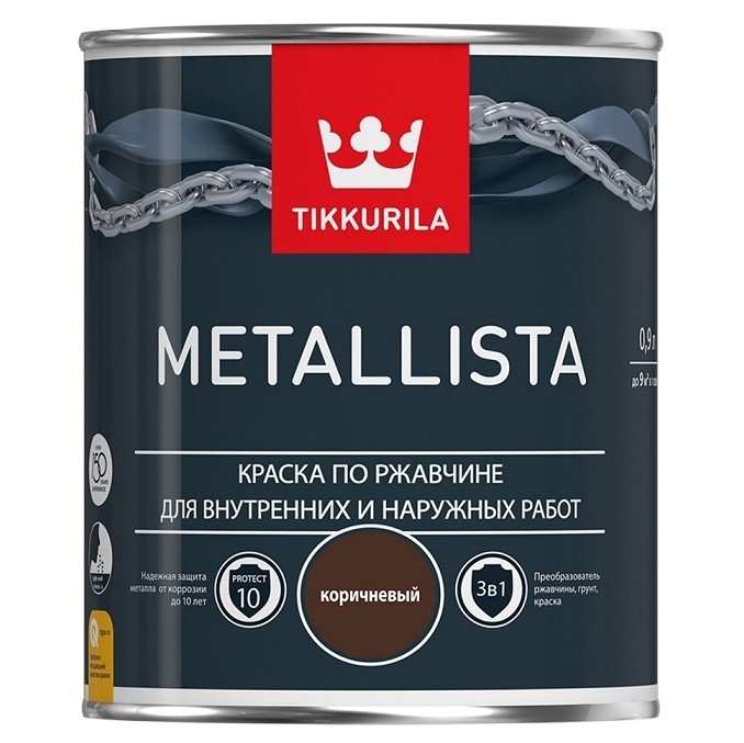 Краска по ржавчине Tikkurila Metallista глянцевая коричневая - специальная атмосферостойкая краска по ржавчине, которая сочетает в себе свойства преобразователя ржавчины, антикоррозионной грунтовки и декоративного финишного покрытия. Позволяет легко проводить окраску металлических поверхностей без тщательной очистки от ржавчины и дополнительного использования грунтовки. Воск в составе материала создает барьер и защищает от проникновения влаги к металлу. Антикоррозионные компоненты краски взаимодействуют со ржавчиной и не дают ей распространяться дальше, надежно защищая металлическую поверхность на длительный срок. Применение: Походит для окраски стальных и чугунных поверхностей с остатками плотно держащейся ржавчины, эксплуатируемых в атмосферных условиях (металлические конструкции, садовая мебель, гаражи, ограды, решетки и т.д.), и внутри помещений. Возможно применение в детских дошкольных учреждениях и помещениях административной группы, лечебно-профилактических учреждениях. Преимущества краски по ржавчине Tikkurila Metallista: Уникальная формула 3 в 1. Можно наносить прямо на ржавую поверхность, отличная укрывистость и адгезия. Бескомпромиссная защита металла. Краска Metallista – это эффективное решение для защиты металлических поверхностей до 10 лет. Теперь вам не придется идти на компромисс, с Metallista вы можете быть уверены, что получите максимум. Атмосферостойкая усиленная воском формула. Воск в составе краски Metallista препятствует проникновению влаги и грязи к основанию, а активные компоненты взаимодействуют со ржавчиной и не дают ей распространяться дальше, образуя нерастворимый защитный слой. Трехступенчатая система защиты металла. Простое решение для сложных поверхностей? Краска Metallista – это преобразователь ржавчины, антикоррозионная грунтовка и декоративное покрытие в одной банке. Теперь окрашивать металлические поверхности можно без дополнительной подготовки! Обратите внимание! Со свежеокрашенной поверхностью следует обращаться осторожно в течение нескольких недель, т.к. при нормальных условиях покрытие достигает своей окончательной твердости только через месяц. В случае, если придется очищать поверхность ранее этого срока, рекомендуется легкая очистка мягкой влажной тканью, избегая натирания. При необходимости, не ранее, чем через месяц после окраски, поверхность можно очистить нейтральным моющим раствором (pH 6–8) с помощью мягкой влажной ткани или щетки. Особенно загрязненные поверхности вымыть слабым щелочным раствором (pH 8–10). Придерживаться инструкций производителя по приготовлению раствора. После очистки поверхность промыть водой и оставить высохнуть.