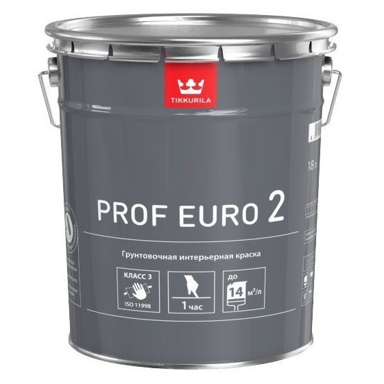 Краска грунтовочная Tikkurila Prof Euro 2 предназначена для окраски стен и потолков в сухих помещениях по бетонным, кирпичным, оштукатуренным, зашпатлеванным поверхностям, гипсокартону, древесностружечным и древесноволокнистым плитам. Это – универсальный продукт, краска подходит как в качестве финишного покрытия для потолка и стен, так и для грунтования поверхностей под все интерьерные краски Prof Euro или обои. Prof Euro 2 колеруется в любые светлые оттенки фирменной коллекции Tikkurila Symphony, кроме того ее можно использовать в качестве белой краски. Краска Prof Euro 2 обладает ключевыми характеристиками, важными для профессиональных маляров – она экономично расходуется, быстро сохнет и не разбрызгивается при нанесении. Расход на 1 слой составляет всего 7-9 м2/л по неровной впитывающей поверхности и 10-14 м2/л по ровной невпитывающей поверхности. Первый слой высыхает за 1 час, а уже через 1,5-2 часа можно наносить следующий слой.Краска образует покрытие, устойчивое к мытью мягкой поролоновой губкой (3 класс стойкости к истиранию по стандарту ISO 11998/ DIN EN 13 300). Она может использоваться в детских учреждениях и помещениях административной группы лечебно-профилактических учреждений. Преимущества: Идеальная для базовой отделки Экономично расходуется и быстро сохнет Обладает 3 классом стойкости к истиранию (ISO 11998) Характеристики: Базис VVA Цвета Для получения пастельных и насыщенных оттенков воспользуйтесь компьютерной колеровкой Tikkurila. База VVA может также использоваться в качестве белой краски Степень блеска Глубоко матовая Расход Расход на 1 слой 10-14 м2/л по ровной невпитывающей поверхности7-9 м2/л по неровной впитывающей поверхности Растворитель Вода Способ нанесения Наносится валиком, кистью или распылением. При необходимости разбавляется водой до 10% по объему. Время высыхания, +23 °C при отн. влажн. воздуха 50 % При (20±2) °C и относительной влажности (65±5)% - 1 час. Следующий слой наносить через 1,5-2 часа Стойкость к мытью Краска образует покрытие, устойчивое к легкому мытью мягкой поролоновой губкой (3 класс стойкости к мокрому истиранию по стандарту ISO 11998/ DIN EN 13 300)После мытья допускается небольшое изменение блеска покрытияЗаданный уровень устойчивости покрытия к мытью достигается через 4 недели Сухой остаток около 58% в зависимости от цвета Плотность 1,4-1,5 кг/л Хранение Краску хранить и транспортировать при температуре выше 0°С, в плотно закрытой таре. Гарантийный срок хранения в невскрытой заводской упаковке 3 года со дня изготовления.