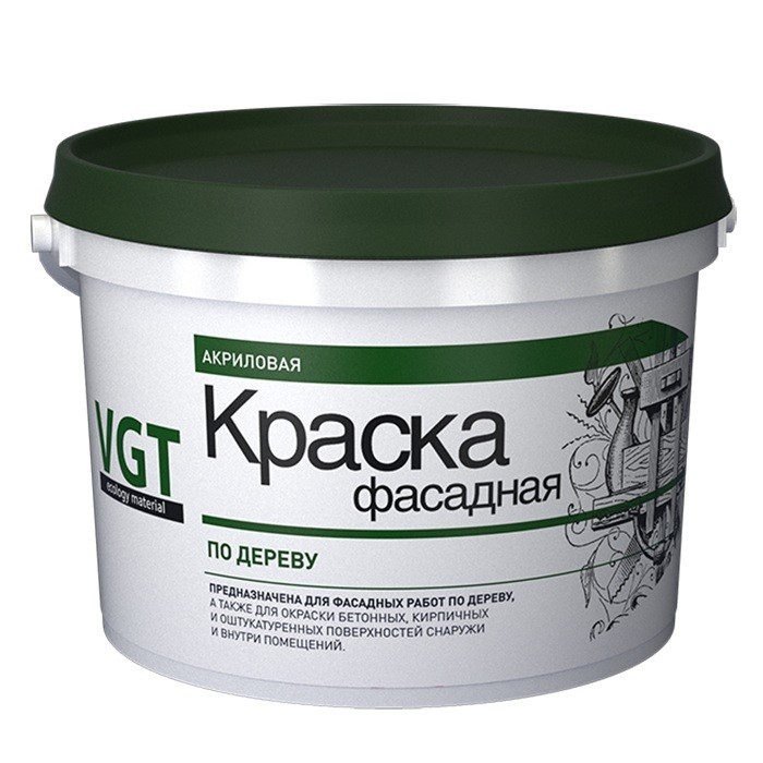 Краска VGT ВД-АК-1180 фасадная по дереву представляет собой белую, вязкую жидкость. После высыхания образует ровную матовую поверхность с белизной не менее 90%. Краска обеспечивает высокую паропроницаемость и эластичность красочной плёнки, что повышает её срок службы на деревянном фасаде. Светостойкая (не желтеет в процессе эксплуатации), обладает водо- и атмосферостойкостью, может колероваться колеровочными красками VGT. Краска предназначена для фасадных работ по дереву, а также для окраски бетонных, кирпичных и оштукатуренных поверхностей как внутри, так и снаружи помещений. Используется во всех типах зданий и сооружений (А-В), в т.ч. в помещениях, для которых предусмотрен режим влажной дезинфекции. Особенности фасадной краски по дереву VGT ВД-АК-1180: после высыхания образует ровную матовую поверхность; светостойкая (не желтеет в процессе эксплуатации); обладает атмосферостойкостью; обеспечивает высокую паропроницаемость и эластичность красочной плёнки. Состав: водная дисперсия полимера, модифицирующие добавки, наполнитель. Применение. Рабочая поверхность должна Быть сухой и чистой. Отслаивающиеся старые покрытия должны быть удалены. Рекомендуется предварительное грунтование поверхности. Не рекомендуется окраска поверхности при повышенной влажност и температуре ниже +7°С. Наносится кистью, валиком или краскопультом. Рекомендуется двукратное нанесение краски с промежуточной сушкой 1 часа. Расход краски составляет 200 г/м² при одинарном нанесении. Время высыхания до отлипа – 1 час, полное высыхание – через 24 часа при нормальных условиях. Хранить в плотно закрытой таре при температуре от 0°С до +40°С. Допускается замораживание до -25°С, но не более 5 циклов замораживания-оттаивания. Срок годности – 18 месяцев с даты изготовления.