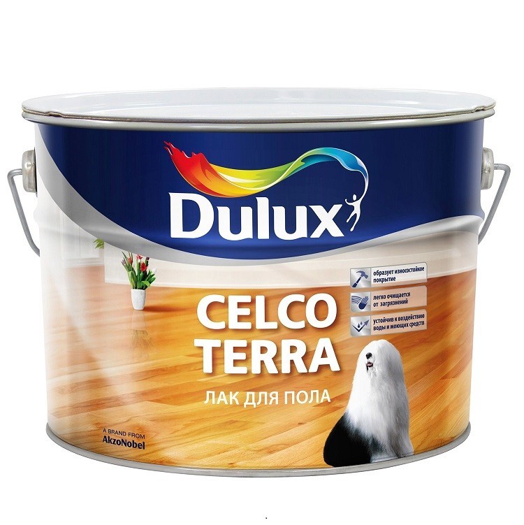 Лак Dulux Celco Terra 20 полуматовый - паркетный алкидно-уретановый лак, образует износостойкое эластичное покрытие, которое устойчиво к ударам, царапинам, бытовой химии и горячей воде. Легко наносится и разравнивается. Полуматовый паркетный лак отлично подчеркивает естественную красоту древесины. Создаёт лакированную поверхность, которая проста в уходе и не требует дополнительных усилий. Для внутренних работ. Подходит для лакирования деревянных и паркетных полов в помещениях с умеренной влажностью и средней эксплуатационной нагрузкой, таких как спальня, гостиная, кабинет, библиотека. Изделие также может использоваться для связывания пыли на бетонных полах. Преимущества лака для пола Dulux Celco Terra 20: Износостойкое эластичное покрытие устойчиво к ударам, царапинам, бытовой химии, горячей воде. Не растрескивается, не отслаивается. Легко наносится и разравнивается. Эффективно связывает пыль на бетонных полах. Подчеркивает естественную красоту древесины. Применение: Перед применением разбавить в рекомендованной пропорции растворителем Solve W и перемешать, не допуская образования пузырьков воздуха. Произвести подготовку поверхности. Алкидно-уретановый лак Dulux Celco Terra 20 рекомендуется наносить два-три слоя при температуре от +5°C до +30°С, относительной влажности воздуха от 40 до 80 %. В качестве первого (грунтовочного) слоя рекомендуется использовать только глянцевый лак. Используйте кисть с натуральным ворсом, аппликатор для лакировки пола или валик. Заданный уровень прочности покрытие достигает в течение 7 дней. Для первого (грунтовочного) слоя разбавить в соотношении не более 1 части уайт-спирита на 10 частей глянцевого лака. Для следующего слоя разбавление не требуется. Для связывания пыли на бетонных поверхностях разбавить в соотношении 1 часть уайт-спирита на 1 часть глянцевого лака.
