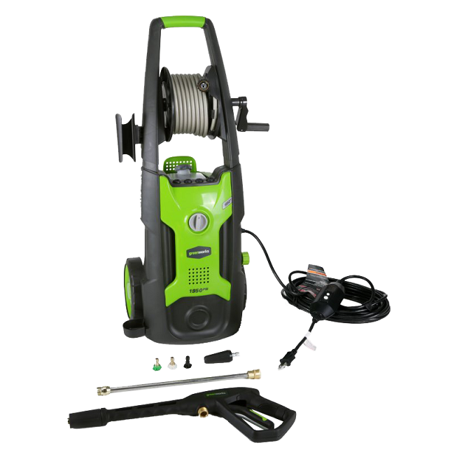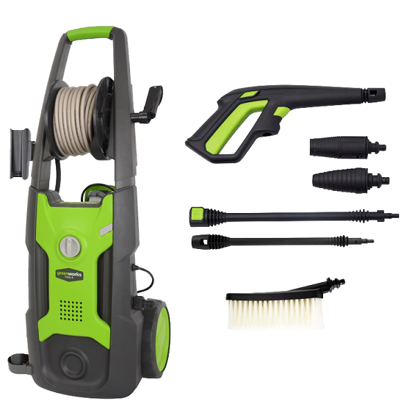 Мойка высокого давления Greenworks GPWG5 — модель относится среднему классу бытовых моек Greenworks. Аппараты высокого давления (минимойки) используются для удаления стойких загрязнений с автомобилей и мытья придомовой территории: оград, крыльца, фасада здания, лестниц, садовых дорожек, декоративных элементов из плитки и камня, садовых каминов и барбекю, а также бассейнов. Это устройство станет Вам незаменимым помощником на загородном участке. Двигатель с медной обмоткой имеет мощность 2000 Вт, что в сочетание с прочной помпой дает высокие показатели производительности — 420 л/час и максимальное давление 140 бар. Материал помпы — алюминий, а материал трехосного поршня — нержавеющая сталь, что в сочетание с автоматическим перепускным клапаном со сбросом избыточного давления делает эту минимойку очень надежной и долговечной. Для экономии расхода воды, а также предотвращения нагнетания избыточного давления мойка оснащена системой полной остановки «FullStop» в случае, когда вы отпускает курок на пистолете распылителе. Быстро зажимные коннекторы позволяют надевать насадки одним движением. Предусмотрен удобный фиксатор барабан для наматывания шланга, а также имеется отделение для хранения насадок и аксессуаров, боковой фиксатор для пистолета. Мойка может работать как в горизонтальном, так и вертикальном положении, а так же имеет защиту от воды, грязи и пыли по стандарту IPX5-S1. Также оснащена фильтром грубой очистки. Максимальная температура воды на входе составляет 40°С. Эта модель обладает функцией забора воды из емкости и не требует подключения к водопроводу. Пенокомплект в этой модели уже встроенный. Приятным дополнением для вас будет широкий набор аксессуаров, включенный в комплект поставки: пистолет распылитель с удлинителем, универсальная насадка с форсункой, турбо насадка, ПВХ шланг длиною 8 метров. Особенности мойки высокого давления Greenworks G5: Мощность 2000W. Высокая производительность помпы — 420 л/час, максимальное давление 140 бар. Материал помпы — нержавеющая сталь и алюминий; Перепускной клапан. Автоматическое отключение при отпускании курка. Фильтр грубой очистки. Функция всасывания. Быстрое крепления насадок. Барабан для намотки шланга. Класс защиты IPX5-S1. Максимальная температура воды 40°С. Прочный ПВХ шланг. Набор аксессуаров в комплекте. Обратите внимание, что вся техника Greenworks имеет расширенную гарантию, в отличии от остальных производителей садовой техники, и составляет 2 года Комплектация: 2000W G5 мойка 140 бар ПВХ шланг 8,0 м Электрический кабель 5 м Пистолет с удлинителем Универсальная насадка с форсункой Турбо насадка Фильтр грубой очистки Руководство по эксплуатации Гарантийный талон
