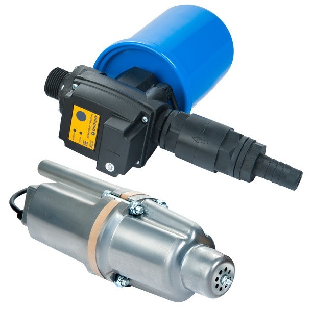 Станция автоматического водоснабжения «Акваробот Вибра» на базе погружного вибрационного насоса «Unipump Бавленец» (россия) — предназначена для подачи чистой холодной воды, не содержащей абразивных частиц и волокнистых включений, из колодцев, скважин, диаметром не менее 100 мм и других источников в автоматическом режиме (включаясь и выключаясь по мере расходования воды потребителем). Станция оснащена электронным блоком, который управляет работой насоса, а также защищает его от работы в режиме «сухого хода» и в других аварийных ситуациях. Не допускается перекачивание станцией воды с грязью, песком, мелкими камнями и мусором. В воде не должны содержаться частицы с линейным размером более 1 мм. Общее количество механических примесей — не более 100 г/м³. Допустимый диапазон температур воды — +1…+30ºС, при температуре окружающей среды от +1 до +40ºС. Максимальная рабочая глубина погружения насоса под зеркало воды — 3 метра. Внимание: Для нормальной работы станции расстояние по вертикали от места установки блока управления с гидроаккумулятором до зеркала воды в скважине или колодце должно быть не более 30 м. Технические характеристики: Напряжение переменного тока, В — 220 Частота, Гц — 50 Номинальная мощность, Вт — 245 Ток, А, не более — 3,7 Максимальный напор, м — 75 Максимальная производительность, л/час — 1600 Объемная подача воды с глубины, л/ч, не менее20 м — 95030 м — 72040 м — 432 Внутренний диаметр скважины, мм, не менее — 100 Температура воды, °С, не более — +35 Модель «Бавленец» - с нижним забором воды Присоединительный размер — 1" наружная резьба х штуцер типа «елочка» для присоединения резиновых шлангов с внутренним диаметром 16-20 мм Забор воды: снизу Длина электрокабеля: 40 м Емкость гидроаккумулятора: 2 л Давление включения насоса Рмин — 1,5 ± 0,5 bar Давление выключения насоса Рмакс — 3,0 ± 0,5 bar Минимальная чувствительность датчика потока — 2 л/мин Давление сжатого воздуха в гидроаккумуляторе — 1,0 - 1,2 bar Устройство и принцип работы станции: Станция состоит из погружного вибрационного электронасоса, гидроаккумулятора, блока управления «Акваробот Турби М3», обратного клапана и штуцера для присоединения гибкого шланга. Электронасос состоит из трех основных узлов: ярма, вибратора и основания. В основании имеются отверстия, прикрытые резиновым клапаном. На выходном патрубке насоса при помощи хомута крепится гибкий шланг. Подача воды осуществляется из напорной камеры, ограниченной резиновым клапаном и поршнем. В результате вибрационных колебаний электромагнитного привода поршень совершает возвратно-поступательные движения и выталкивает под напором воду из выходного патрубка насоса. Гидроаккумулятор состоит из стального корпуса, внутри которого расположена мембрана из EPDM резины. Между корпусом и мембраной, при помощи пневмоклапана, под давлением закачан воздух. Гидроаккумулятор служит для поддержания и плавного изменения давления в системе. Блок «Акваробот Турби М3» управляет процессом включения и выключения насоса по давлению и потоку и защищает его от работы в режиме «сухого хода» и в других аварийных ситуациях. Блок автоматически включает насос, когда давление в системе упадет до заданной величины Рмин (1,5±0,5 bar) и выключает насос, когда давление в системе достигнет величины Рмакс (3,0±0,5 bar). Если в силу каких-либо причин, насос не может создать в