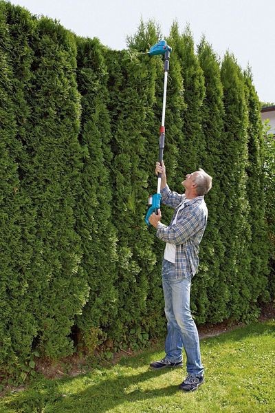 Телескопические ножницы для живой изгороди Gardena THS Li-18/42 08881 прекрасно подходят для обработки высоких и низких живых изгородей. Благодаря раздвижной штанге и малому весу инструмента пользователь легко может добираться до труднодоступных мест без использования стремянок и не прилагая усилий. Требуется просто установить длину ножниц в соответствии с желаемой высотой (до 3 м). Благодаря регулировке наклона режущей головки обеспечивается удобная обрезка верха живой изгороди стоя на земле. Вдобавок, легко обработать нижнюю часть живой изгороди без необходимости нагибаться. Оптимизированная геометрия лезвий способствует эффективному, быстрому и чистому резу. Литиево-ионный аккумулятор 18 В 2.0 А.ч обеспечивает долгое время работы – до 75 минут без подзарядки. Индикатор уровня заряда POWERinfo на аккумуляторе показывает, когда требуется подзарядить аккумулятор. Полная зарядка аккумулятора занимает около 3-х часов. Преимущества ножниц Gardena THS Li-18/42 08881: Могут использоваться для обработки высоких и низких живых изгородей. Поворачиваемый режущий блок позволяет легко и с комфортом обрабатывать как высокие, так и низкие живые изгороди Непревзойденная производительность. Телескопические аккумуляторные ножницы для живой изгороди могут функционировать до 75 минут на одной зарядке аккумулятора. Телескопическая рукоятка. Легкая рукоятка телескопически регулируется. Благодаря этому возможно обрабатывать изгородь на высоте до 3 метров – стоя на земле. Долговечность и независимость от сети питания. Мощный литиево-ионный сменный аккумулятор обеспечивает продолжительное время работы и совместим со многими другими аккумуляторными инструментами Gardena. Благодаря индикации уровня заряда POWERinfo всегда виден текущий уровень оставшейся энергии аккумулятора.