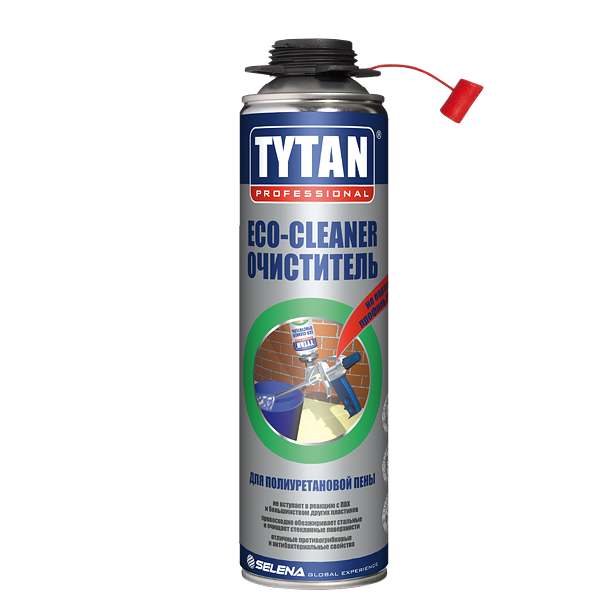 Очиститель для полиуретановой пены Tytan Eco-Cleaner - Универсальное средство для удаления не отвердевшей полиуретановой пены и клея. Продукт менее агрессивен к профилям ПВХ и коже человека по сравнению с другими распространенными средствами для очистки. Отлично подходит для обезжиривания металлических поверхностей перед нанесением герметика или полиуретана. Титан Eco Cleaner может быть также использован для очистки оконных стекол и защиты их от конденсата (предотвращает запотевание). Высокие антисептические свойства способствуют удалению грибков и бактерий с очищаемых поверхностей. Газ, содержащийся внутри баллона, безопасен для озонового слоя. Высококачественный очиститель Tytan Eco производится в соответствии с ISO 9001. Титан применяется для очистки дозирующего оборудования, его внутренних и внешних частей, удаления остатков неотвердевшей однокомпонентной пены и полиуретанового клея, обезжиривания металлических поверхностей. Применение: Очистка клапанов баллонов и адаптеров пистолетов. Удаление остатков не отвердевшей пены. Очистка и обезжиривание стеклянных и металлически поверхностей перед пнанесением пены или герметика. Преимущества очистителя полиуретановой пены Tytan Eco-Cleaner: отсутствие следов на ПВХ и других пластиках; быстродействие; высокие антисептические свойства; безвреден для озонового слоя - не содержит CFC and HCFC.