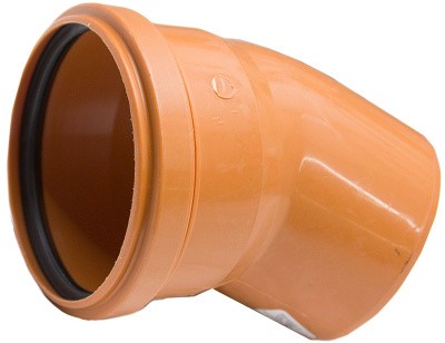 Отвод наружный d=110мм 45°. Отводы для канализационных труб применяются для плавного изменения направления движения потока жидкости в трубопроводе. Конструктивно имеет раструб под соединение с помощью резинового уплотнительного кольца с одной стороны и гладкий конец со снятой фаской с другой.
