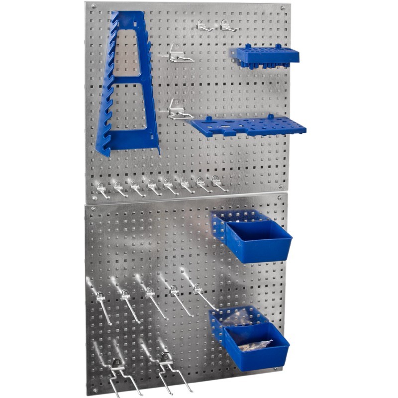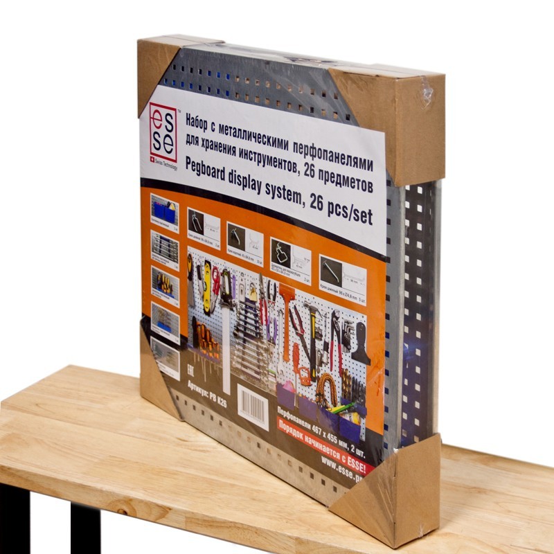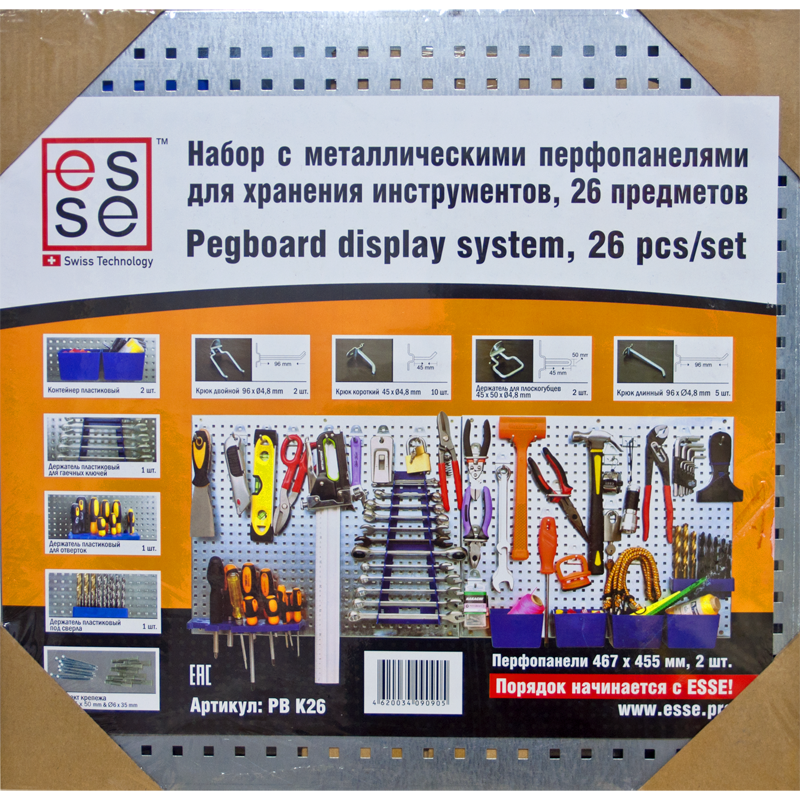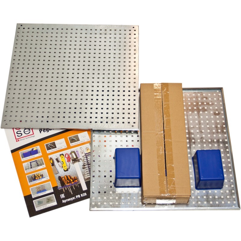 Esse PBK26 - набор с металлическими перфопанелями (2 шт) для хранения инструментов. 26 предмета. Набор самодостаточен, в нём есть практически все необходимое для размещения рабочего инструмента: Контейнеры пластиковые - 2 шт. Держатель пластиковый для гаечных ключей - 1 шт. Держатель пластиковый для отвёрток -1 шт. Держатель пластиковый для свёрл -1 шт. Крюк двойной длина 96 мм - 2 шт. Крючок одинарный короткий 45 мм - 10 шт. Держатель для плоскогубцев 45 х 50 мм - 2 шт. Крючок длинный 95 мм - 5 шт. Комплект крепежа. Любой свободный участок на стене, при помощи перфопанели, можно превратить место хранения инструмента. Материал - сталь, пластик. Характеристики перфорированных панелей: Размер панелей 467х455 мм, толщина металла 0,7 мм. Цвет: естественный цвет металла. Материал: сталь, оцинкованная. Шаг перфорации - 1.8 см (подвесы для шага 2,5 см к этому набору не подходят). Перфорация прямоугольная, размер перфорации - 6 мм. Минимальный зазор выдержан загибом металла - 10 мм. (при установке, не требуется прокладок между стеной и панелью).