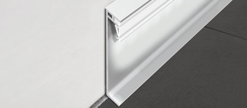 Плинтус с подсветкой, алюминиевый анодированный серебро, PKGLEDAA 80 - PROSKIRTING GILED, Progress profiles. Инновационный плинтус из анодированного алюминия (серебро) и из блестящего алюминия (хром), доступен в высотах 80 и 100 мм, с верхним профилем из жёсткой виниловой смолы, имеющим видимую поверхность размером 17,5 мм и доступным в 9 отделках под мрамор и снабжен с системой освещения интегрированных светодиодов, производящей рассеянный непрямой свет. PROSKIRTING GILED можно исползовать как плинтус и также как профиль-накладка для потолочных швов, если он вращается на 180 градусов. Обеспечивает покрытие окружных шов до 15 мм. Свет генерируемый светодиодами отражается от алюминевой поверхности плинтуса и создают особенный и модерный эффект. Комплектующие элементы, такие как внутренний/внешний угол и пробки обеспечивают безукоризненную укладку и эстетически прятный результат.ВЕРХНИЙ ПРОФИЛЬ ИЗ ПВХ, БЛОК ПИТАНИЯ, СВЕТОДИОД, ПЛОСКИЙ КАБЕЛЬ В КОМПЛЕКТ НЕ ВХОДЯТ