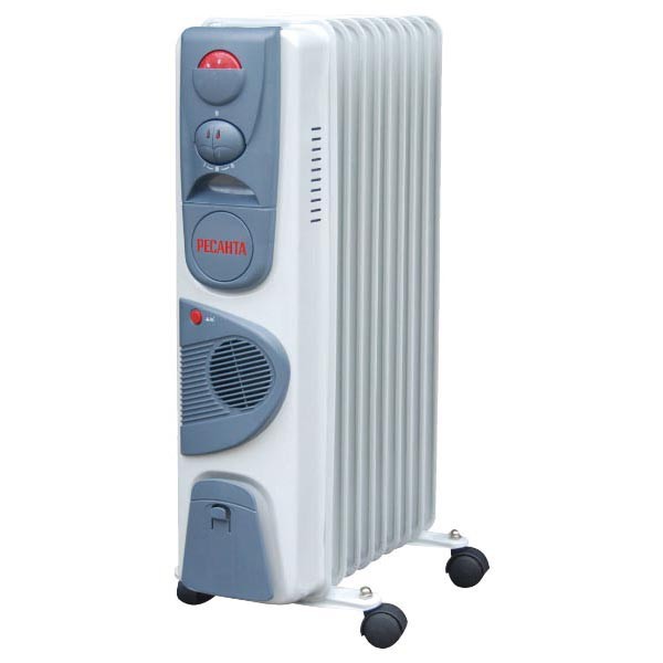 Данный радиатор предназначен для обогрева небольших помещений. Использование масла значительно увеличивает коэффициент полезного действия аппарата, т.к. масло обладает высокой теплопроводностью и очень долго остывает. Однако требования к безопасности масляных радиаторов – повышенные. Аппарат имеет несколько нагревательных рёбер, которые располагаются вертикально. Передняя продолговатая панель имеет рукоятку в виде углубления. Также под ручкой располагаются регулятор температуры (термостат) и переключатель режимов работы. Термостат позволяет поддерживать нужный уровень температуры длительное время. Модель отличается высоким КПД, низким уровнем создаваемого шума, не сушит воздух во время работы. В случае сильного перегрева или опрокидывания конструкции, специальные датчики автоматически приостановят обогрев. Транспортировка может осуществляться с помощью четырёх подвижных колёс. Особенности радиатора масляного с тепловентилятором Ресанта ОМ-7НВ Три режима работы Радиатор имеет три режима обогрева, которые переключаются удобной ручкой. Термостат Прибор оснащен термостатом, который регулируется специальной ручкой и позволяет прибору автоматически поддерживать необходимую температуру. Визуальный контроль Световой индикатор позволяет контролировать рабочее состояние радиатора. Удобство перемещения Для удобства перемещения конструкция прибора оснащена колесами Преимущества радиатора масляного с тепловентилятором Ресанта ОМ-7НВ Режим поддержания температуры; Современный дизайн; Три режима обогрева; Механическое управление; Малые габариты, небольшой вес.