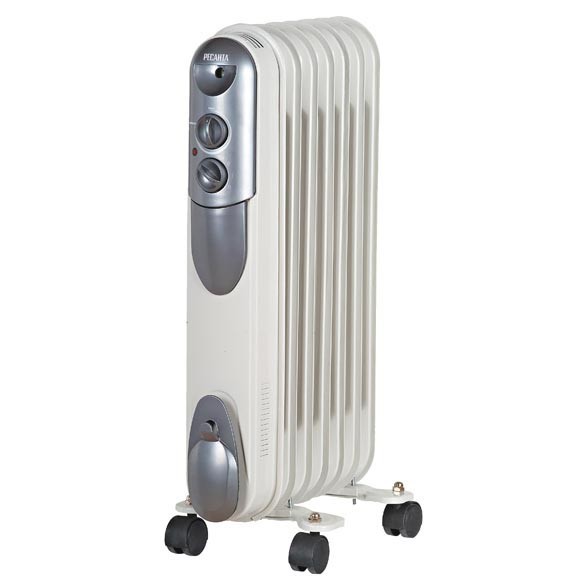 Данный радиатор предназначен для обогрева небольших помещений. Использование масла значительно увеличивает коэффициент полезного действия аппарата, т.к. масло обладает высокой теплопроводностью и очень долго остывает. Однако требования к безопасности масляных радиаторов – повышенные. Аппарат имеет несколько нагревательных рёбер, которые располагаются вертикально. Передняя продолговатая панель имеет рукоятку в виде углубления. Также под ручкой располагаются регулятор температуры (термостат) и переключатель режимов работы. Термостат позволяет поддерживать нужный уровень температуры длительное время. Модель отличается высоким КПД, низким уровнем создаваемого шума, не сушит воздух во время работы. В случае сильного перегрева или опрокидывания конструкции, специальные датчики автоматически приостановят обогрев. Транспортировка может осуществляться с помощью четырёх подвижных колёс. Особенности радиатора масляного Ресанта ОМПТ-7Н Три режима работы Радиатор имеет три режима обогрева, которые переключаются удобной ручкой. Термостат Прибор оснащен термостатом, который регулируется специальной ручкой и позволяет прибору автоматически поддерживать необходимую температуру. Визуальный контроль Световой индикатор позволяет контролировать рабочее состояние радиатора. Удобство перемещения Для удобства перемещения конструкция прибора оснащена колесами Преимущества радиатора масляного Ресанта ОМПТ-7Н Режим поддержания температуры; Современный дизайн; Три режима обогрева; Механическое управление; Малые габариты, небольшой вес.