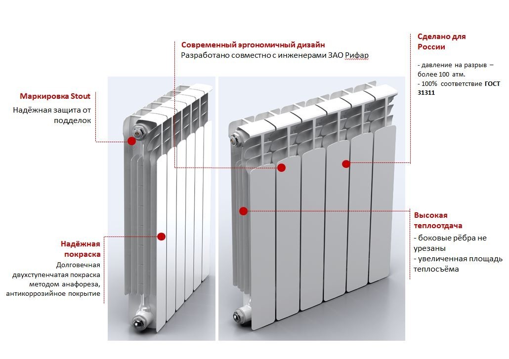 Радиаторы отопления Stout – основные элементы системы водяного отопления. Они предназначен для передачи тепловой энергии от теплоносителя к воздуху помещения.Биметаллические секционные радиаторы Stout Space предназначены для применения в системах водяного отопления зданий различного назначения. Радиаторы Stout Space собираются из отдельных секций, которые изготавливаются из качественного алюминиевого сплава методом литья под давлением. Каждая секция представляет собой единый монолит из двух коллекторов и связывающего их оребрения, внутри которого проходит вертикальный канал из стальной трубы внутренним диаметром 12,8 мм. Такая конструкция в сочетании с особой формой оребрения обеспечивают высокие теплотехнические показатели радиатора, низкое гидравлическое сопротивление и значительную прочность. В отверстиях коллекторов выполнена трубная резьба размером 1" (с одной стороны правая, а с другой – левая). Резьба служит для соединения секций между собой в радиаторы различной длины с помощью стальных резьбовых ниппелей. Геометрия ниппельных соединений и параметры силиконовых прокладок гарантируют надежную герметичность собранного радиатора. Наружная поверхность секции радиатора окрашена порошковой эмалью (двухступенчатая технология окраски) белого цвета (RAL 9010). Характеристики: Количество секций: 4 Длина, мм: 320 Теплоотдача, Вт: 536 Высота, мм: 415, глубина, мм: 90 Межосевое расстояние, мм: 350 Давление опрессовки, МПа: 3 Рабочее (избыточное) давление теплоносителя, МПа: 2 Конструкция: секционные, емкость секции 0,18 л Тип подключения: боковое Вид теплоносителя: вода Температура теплоносителя, С: 135 100% контроль на герметичность, давление на разрыв более 100 атм Антикоррозийное покрытие, двухэтапная покраска Для обеспечения паспортной теплоотдачи необходимо соблюдать следующие расстояния между радиатором и ограждающими конструкциями здания (рис.): от верха радиатора до подоконника – не менее 80 мм; между стеной и радиатором – не менее 30 мм; от пола до радиатора – не менее 70 мм. Изготовитель не рекомендует производить перегруппировку радиаторов с целью уменьшения или увеличения количества секций, а также замену отдельных секций радиатора. Теплоноситель (вода) в системе отопления с радиаторами Stout Space должен соответствовать «Правилам технической эксплуатации электрических станций и сетей Российской Федерации», Минэнерго, 2003 и отвечать следующим требованиям: Водородный показатель рН 7 – 8,5 Общая жесткость, мг-экв/л до 7 Содержание растворенного кислорода, мкг/л не более 20 Количество взвешенного вещества, мг/л не более 5 Содержание железа, мг/л не более 0,5 Возможные схемы подключения радиаторов Stout Space к трубопроводам системы отопления: Stout – современное оборудование высокого европейского качества, отвечающее последним достижениям научно-технического прогресса и требованиям российских стандартов.Радиаторы Stout разработаны специально для российских систем отопления и полностью отвечают требованиям ГОСТ 31311-2005 «Приборы отопительные». При производстве оборудования применяются материалы, безопасные для здоровья покупателя и окружающей среды. Вся продукция имеет европейские и российские сертификаты качества: ГОСТ, СГР, DIN, EN.Благодаря превосходному внешнему виду они идеально вписываются в интерьер квартир и частных домов самых взыскате