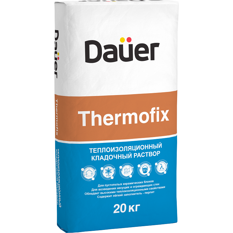 Цементная смесь Dauer Thermofix предназначена для возведения несущих и ограждающих стен из блоков с высокими теплоизоляционными свойствами: крупноформатных керамических блоков («теплая» керамика), легкого пустотелого кирпича с вертикальными пустотами, пористого бетона и блоков из бетона на пористых заполнителях. Раствор изготовлен с применением внутреннего армирования полимерными фиброволокнами, которые позволяют исключить оседание раствора в полости блоков, повышает прочность на изгиб и увеличивает прочность сцепления блоков на сдвиг относительно друг друга. Применяется для возведения однородных по теплопроводности стен. Содержит легкий заполнитель – перлит, который предотвращает образование мостиков холода в кладочных швах. Предназначен для наружных и внутренних работ.