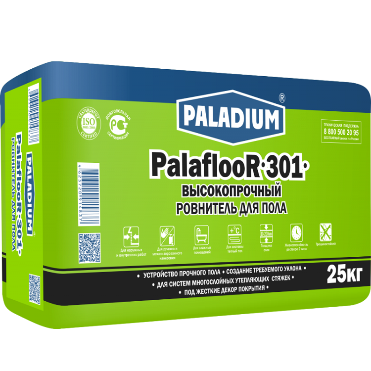 Цементный ровнитель для пола Paladium PalaflooR-301 изготовлен на основе высококачественного цемента, фракционированного песка и комплекса модифицирующих добавок. Предназначен для стартового (основного) выравнивания горизонтальных поверхностей. Используется ручным или механизированным способом нанесения для устранения больших перепадов поверхности, высококачественного выравнивания и подготовки пола под укладку различных видов декоративных покрытий: керамической плитки, керамогранита, стеклянной мозаики, плитки из натурального камня, ламината, линолеума, текстильных ковровых и пробковых покрытий и др. Он также идеально подходит в качестве основания под паркетную доску, классический и модульный паркет. Высокопрочный ровнитель является долговечной, надежной основой для финишного пола PalaflooR-303 и способен выдерживать нагрузки до 200 кг/см2. PalaflooR-301 рекомендуется применять во всех системах многослойных теплоизоляционных стяжек. Идеально подходит для укрывания коммуникаций и выравнивания оснований под уклоном. Ровнитель укладывается поверх цементного, цементно-песчаного, бетонного (монолитного, панельного) пола. Раствор не требует увлажнения в процессе высыхания, что значительно облегчает процесс работы с материалом. После высыхания обеспечивает долговечность материала на протяжении всего срока эксплуатации. При необходимости если нужно выровнять поверхность, не создавая существенной нагрузки на основание (например, в ветхом жилом фонде; при осуществлении реставрационных работ; при ограниченных возможностях фундамента; большие лоджии; перекрытия дома или коттеджа) в качестве сверхлегкого пола рекомендуется использовать легкую тепло-звукоизоляционную стяжку Paladium PalaflooR-307. Особенности ровнителя для пола Paladium ParaflooR-301: Экологически чистый материал, не содержит и не выделяет опасных веществ. На цементной основе для наружных и внутренних работ. Для ручного и механизированного нанесения. Для внутренних помещений с нормальным и повышенным уровнем влажности, в том числе неотапливаемые помещения (санузлы, ванные, душевые комнаты, подвалы и т.п.). Для основного выравнивания горизонтальных поверхностей. Для придания поверхности требуемого уклона. Для применения в системе «теплый пол» с электрическим и водяным подогревом при использовании труб большого диаметра. Для устройства «плавающих» полов (по тепло-, звуко-, гидроизоляционным слоям). Для выравнивания пола подвалов, веранд и беседок. Под жесткие декоративные покрытия. Высокая адгезия с традиционными строительными минеральными основаниями. Высокая трещиностойкость и виброустойчивость готовой поверхности. Прочный безусадочный материал. Долговечность поверхности на протяжении всего срока эксплуатации. При толщине слоя 10 мм средний расход сухой смеси составляет 17-18 кг/м². Реальный расход зависит от степени ровности основания. При использовании штукатурных станций расход может возрастать в зависимости от используемой станции и грамотности её регулировки.