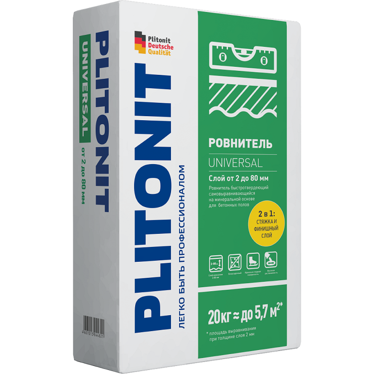 Ровнитель для пола Plitonit Universal предназначен для выравнивания и корректирования бетонных полов и монолитных цементных и полимер-гипсовых стяжек, внутри сухих и влажных жилых (конторских) помещений, под укладку напольной керамической плитки, выстилающих покрытий, паркета и использования в системе «теплый пол». Возможна эксплуатация во влажных помещениях. Не подлежит окраске и использованию без напольного покрытия. Состав: минеральное вяжущее, наполнители, модифицирующие добавки. Особенности ровнителя Plitonit Р1 Pro: Высокая подвижность. Безусадочность и трещиностойкость. Выравнивание слоем от 2 до 80 мм (в углублениях до 100 мм). Возможность хождения через 3 часа.