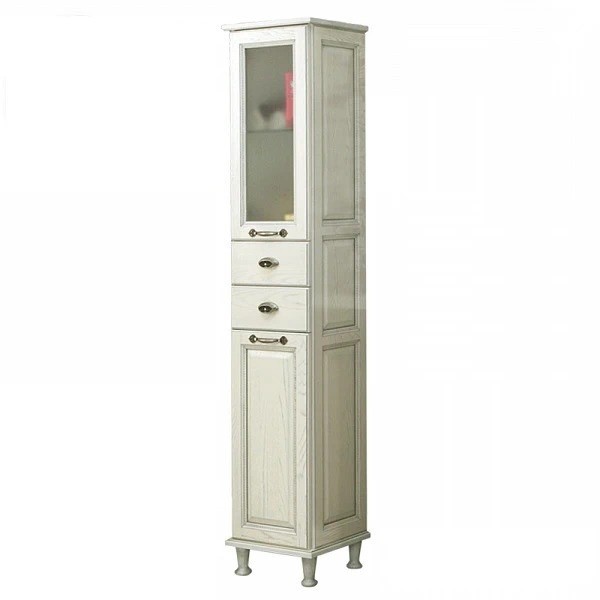 Шкаф-пенал Жерона - модель выполненная в ретро-стиле в цвете белого и серебра, которая может стать жемчужиной в интерьере вашей ванной комнаты. Шкаф оснащен двумя дверцами и двумя выдвижными ящиками, за каждой дверцей находится регулируемая по высоте стеклянная полка. Все ящики и дверцы оборудованы механизмами плавного хода, позволяющим закрывать шкаф тихо и плавно. Фасады изготовлены в Италии из массива дерева.