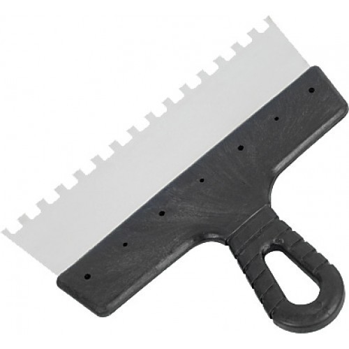 Чтобы обеспечить высокое качество и эстетику при обработке поверхностей в процессе работы необходимо использовать профессиональные инструменты. Зубчатые шпатели Master Color станут незаменимыми инструментами в отделочных работах. Шпатель зубчатый Master Color 30-2337 150 мм зуб 8х8 мм с пластиковой ручкой удобен для используется для нанесения плиточного клея на поверхность. Равномерное распределение состава обеспечивается наличием зубьев. Нержавеющая немецкая сталь устойчива к воздействию химикатов.