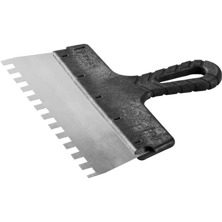 Шпатель Зубр Мастер представляет собой инструмент первой необходимости при работе с различными строительными смесями. Он очень удобен для нанесения и выравнивания клеевых и строительных смесей. Конструкция шпателя состоит из нержавеющего полотна, оснащенного зубьями 10х10 мм, и пластиковой рукоятки. Упругое полотно из нержавеющей стали обеспечивает надежность, защиту от коррозии и длительный срок службы инструмента. Пластиковая рукоятка позволяет комфортно работать в течение продолжительного времени. В ручке имеется отверстие для подвешивания шпателя в вертикальном положении.