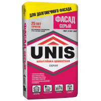 Цементная фасадная шпатлевка Unis Фасад серая предназначена для финишного выравнивания поверхностей фасадов зданий, заделки выбоин, трещин, раковин слоем до 6 мм под последующую отделку декоративными покрытиями. Купить шпатлевку рекомендуется для наружных и внутренних работ, внутри сухих, влажных или неотапливаемых помещений. Преимущества финишной шпатлевки Unis Фасад: Атмосфероустойчивая. Пластичная и удобная в нанесении. Водо- и морозостойкая. Увеличивает срок службы декоративных покрытий. Строительная смесь Unis Фасад рекомендуется для высококачественного окрашивания. Применяется по недеформирующимся основаниям: гипсовым (ГКЛ и ГВЛ) и цементным (бетон, штукатурки). При проведении работ, а также в течение срока твердения раствора следует соблюдать температуру воздуха и температуру основания в пределах +5...+30°С и уровень влажности воздуха не более 75%. Подготовка поверхности. Основание должно быть ровным, прочным, сухим. Перед нанесением материала необходимо удалить с поверхности осыпающиеся элементы, малярные покрытия, масляные, битумные пятна и другие загрязнения, препятствующие сцеплению материала с поверхностью. Для усиления прочности сцепления материала с основанием необходимо обработать поверхность грунтом Unis в один-два слоя. Выбор грунта Unis осуществляется в соответствии с типом основания. Не следует допускать запыления загрунтованных поверхностей. Перед проведением последующих работ следует дождаться полного высыхания грунта. Углубления, выбоины, раковины, трещины глубиной более 6 мм предварительно заделать штукатурной смесью «Силин Цокольный» или «Силин Фасадный». Приготовление финишной шпатлевки. Для приготовления раствора сухую строительную смесь засыпать в емкость с чистой водой (на 1 кг сухой смеси 0,28-0,32 л) и перемешать до получения однородной массы в течение 3-5 минут. Дать раствору отстояться 3-5 минут и повторно размешать. Перемешивание производится механизированным способом – профессиональным миксером с насадкой на малых оборотах. Ручное перемешивание допускается при массе затворяемой смеси не более 1 кг. Приготовленная порция раствора должна быть израсходована в течение 120 минут. Внимание! При приготовлении раствора необходимо соблюдать соотношение «сухая смесь - вода». Не допускается добавление в сухую строительную смесь любых компонентов, кроме воды. Добавление в уже готовый раствор любых компонентов, в том числе воды, ведёт к изменению заявленных производителем свойств материала. Для приготовления раствора использовать только чистые емкости и инструмент. Нанесение материала. Небольшую порцию приготовленного раствора при помощи шпателя нанести на обрабатываемую поверхность. Удерживая шпатель под углом к основанию с сильным нажимом тщательно размазать раствор по поверхности вертикальными или горизонтальными движениями до получения необходимого слоя. В случае необходимости финишная шпатлевка может наноситься в несколько слоев. Вторичное нанесение шпатлевки возможно только после полного высыхания предыдущего слоя. Перед нанесением нового слоя шпатлевки поверхность необходимо обработать грунтом UNIS и дождаться его высыхания. Время высыхания слоя шпатлевки толщиной 6 мм около 2-3 суток, в зависимости от температуры окружающей среды и основания. В процессе высыхания финишной шпатл