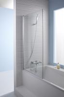 Это современная шторка для ванны, выполненная из стекла. Модель представляет собой реверсивный экран, панели которого открываются наружу и внутрь. Благодаря встроенной подъёмной системе, шторка легко открывается. Конструкция оснащена блестящими хромированными профилями и прозрачным стеклом.