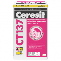 Штукатурка минеральная декоративная Ceresit CT 137 под покраску - тонкослойная штукатурка с зерном 1,5 мм для применения внутри и снаружи зданий. Сухая строительная смесь предназначена для выполнения декоративного тонкослойного покрытия на бетонных основаниях, традиционных штукатурках, гипсовых основаниях, плитах ДСП, гипсокартоне и т.п. Может также служить в качестве декоративно-защитного слоя в легких штукатурных системах утепления наружных стен зданий при использовании в качестве утеплителя как минераловатных, так и пенополистирольных плит. Штукатурка Ceresit CT 137 выполнена в версии под окраску. Это позволяет реализовать любое цветовое решение отделки. Окраску штукатурки можно производить акриловой краской Ceresit CT 42 (через 7 суток), силикатной краской Ceresit CT 54 (через 3 суток) и силиконовой краской Ceresit CT 48 (через 7 суток). Строительная смесь Ceresit CT 137 можно применять на ровных, сухих, плотных основаниях, очищенных от веществ, препятствующих адгезии (жир, битум, пыль и т.п.). Неровные и поврежденные поверхности необходимо тщательно выровнять и отремонтировать. Штукатурку наносят на основание теркой из нержавеющей стали, которую держат под углом 60° к поверхности. Толщина слоя должна соответствовать размеру зерна заполнителя. Спустя некоторое время, когда материал перестанет прилипать к инструменту, формируют фактуру покрытия при помощи пластиковой терки, которую держат строго параллельно поверхности. Фактуру формируют легкими скользящими движениями, избегая нажима на штукатурный слой. «Камешковую» фактуру формируют мелкими круговыми движениями терки, направленными в одну сторону, как правило, против часовой стрелки Материалы с большим содержанием зерен одной и той же фракции имеют более однородный вид. Затираемые пластиковым полутерком, они приобретают фактуру густо уложенных мелких камешков, так называемую «камешковую» фактуру. У фактурной штукатурки для стен элегантная поверхность, а неоднородность размеров и расположение зерен подчеркивают архитектурную особенность здания. Особенности штукатурки Ceresit CT 137: пригодна для механизированного нанесения; экологически безопасна; пригодна для внутренних и наружных работ; атмосферо- и морозостойкая; устойчива к ультрафиолетовым лучам; гидрофобная; обладает высокой паропроницаемостью; ударопрочная. Работы следует выполнять в сухих условиях, при температуре воздуха и основания от +5 °С до +30 °С. Строительная смесь Ceresit CT 137 содержит цемент и при гидратации имеет щелочную реакцию, поэтому во время работы необходимо защищать глаза и кожу.
