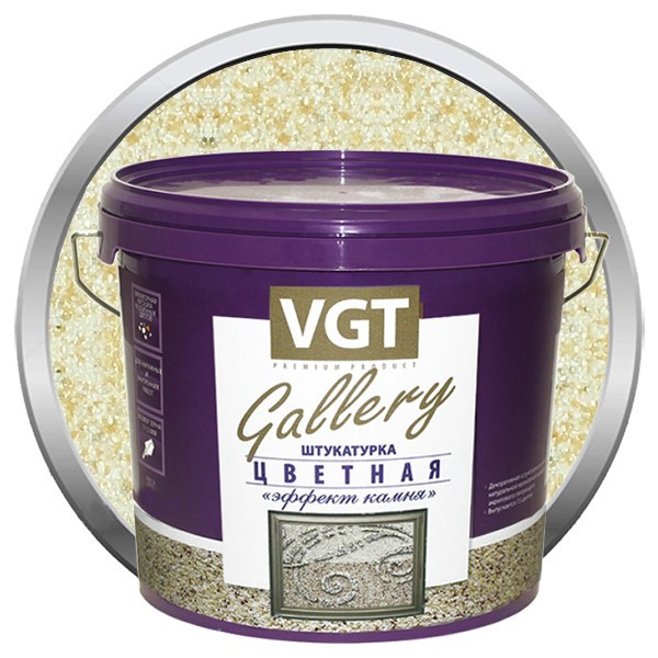 Штукатурка с эффектом камня VGT Gallery №13 кварц с глиттером золото мелкозернистая - декоративное покрытие с эффектом камня на основе мраморной крошки и стирол-акрилового сополимера. Применяется для внутренней и наружной отделки во всех типах зданий и сооружений (А-В), в том числе, для которых предусмотрен режим влажной дезинфекции. Строительная смесь VGT мелкозернистая (размер зерна 0.2-0.5 мм). Обладает водо- и атмосферостойкостью, высокой адгезией к бетонным, кирпичным, оштукатуренным и другим минеральным поверхностям. Обладает высокой твердостью. Образует „дышащее” покрытие. Состав: водная дисперсия стирол-акрилового сополимера, модифицирующие добавки, грубодисперсный наполнитель - мраморная крошка. Преимущества цветной штукатурки с эффектом камня VGT Gallery: высокая адгезия к бетонным, кирпичным, оштукатуренным и др. минеральным поверхностям; отличается высокой водо- и атмосферостойкостью; широкая цветовая гамма (6 цветов); для наружных и внутренних работ; образует «дышащее» покрытие; обладает высокой твёрдостью. Применение: Рабочая поверхность должна быть сухой и чистой. Отслаивающиеся старые покрытия должны быть удалены. Все трещины, пустоты и повреждения отремонтировать шпатлёвкой универсальной и выровнять финишной шпатлёвкой ТМ «VGT». При нанесении цветной штукатурки важен цвет основания и его равномерность, поэтому перед нанесением материала поверхность рекомендуется загрунтовать грунтовкой адгезионной ТМ „VGT”, заколерованной в цвет выбранной штукатурки . Сильно впитывающие и осыпающиеся поверхности предварительно обработать грунтовкой глубокого проникновения ТМ «VGT». Ориентировочный расход штукатурной строительной смеси: мелкозернистой - до 3 кг/м². Перед применением тщательно размешать штукатурку на низких оборотах. При необходимости разбавить водой не более 5%. Штукатурка наносится в один слой (толщиной примерно 1,5 - 2 зерна) с помощью кельмы из нержавеющей стали движениями снизу вверх, начиная с верхней части поверхности. Важно соблюдать равномерность наносимого слоя. Через 15-20 минут после нанесения рекомендуется пригладить покрытие мокрой кельмой. Полное высыхание через 48 часов при температуре (20±3)°С и относительной влажности воздуха (65±5)%. Работы проводить при температуре не ниже +7°С и отн. влажности воздуха не более 80%. Обратите внимание! Во избежание разнооттеночности при отделки объекта следует приобретать единовременно весь объём материала. Подгонка цвета по номеру партии не возможна. Перед нанесением штукатурки одного цвета, но разных партий, рекомендуется смешать их в одной ёмкости до образования однородного цвета. Хранить штукатурную строительную смесь необходимо в плотно закрытой таре при температуре от 0°С до +40°С. Выдерживает замораживание до -25°С, но не более пяти циклов замораживания-оттаивания. Размораживают при температуре (20±5)°С и тщательно размешивают до получения однородной массы. Срок годности 24 месяца с даты изготовления.