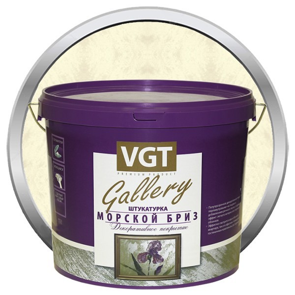 Штукатурка декоративная VGT Gallery Морской бриз МВ-101 база серебристо-белая - полупрозрачное декоративное покрытие с перламутровыми частицами и добавлением речного песка, создающее эффект легкого ветерка или парящих облачков. Эффектно смотрится как в обычной квартире, так и в офисных помещениях, гостиничных комплексах, ресторанах. Строительная смесь VGT имеет высокую адгезию к бетонным, кирпичным, оштукатуренным, гипсокартонным и т. п. поверхностям. Штукатурка обладает влагостойкостью и стойкостью к мытью. Может колероваться колеровочными пастами. Каждый базовый цвет может использоваться как самостоятельное покрытие, смешиваться между собой или в качестве базы под колеровку для получения необходимого цвета. Состав: водная дисперсия полимера, модифицирующие добавки, наполнитель, перламутровый пигмент, речной песок. Преимущества декоративной штукатурки VGT Gallery Морской бриз: высокая адгезия к бетонным, кирпичным, оштукатуренным, гипсокартонным и др. поверхностям; влагостойкость; стойкость к мытью. Применение: Рабочая поверхность должна быть сухой, чистой, ровной и гладкой. Рекомендуется предварительно зашпатлевать поверхность финишной шпатлёвкой и загрунтовать грунтовкой глубокого проникновения т.м. ВГТ для выравнивания впитывающей способности основания. Перед нанесением штукатурной строительной смеси поверхность рекомендуется окрасить цветной краской выбранного оттенка. Расход штукатурки: зависит от толщины слоя и заданного рисунка и варьируется от 150 до 200 г/м². Материал наносится при помощи щетки или широкой кисти хаотичными или перекрещивающимися мазками. Затем, не дожидаясь высыхания, песчинки красиво распределить по поверхности, создавая эффект парящих облачков. При необходимости строительную смесь можно заколеровать высококонцентрированными колеровочными пастами ТМ „ВГТ”. При формировании рисунка рекомендуется производить работы на участках площадью 0,7 — 1,0 м2. Во избежание появления видимых стыков не желательно оставлять прямолинейные границы между участками. До отлипа — 1-2 часа, полное высыхание через 24 часа при температуре (20±3)°С и отн. влажности воздуха (65±5)%. Работы производить при температуре не ниже +7°С и отн. влажности воздуха не более 80%. Полный набор прочности и устойчивость к влажной уборке достигается через 2 недели. Хранить в плотно закрытой таре при температуре от +5°С до +40°С.Не замораживать. Не подвергать воздействию прямых солнечных лучей. Не складировать вблизи работающих нагревательных элементов. Срок годности 24 месяца с даты изготовления.