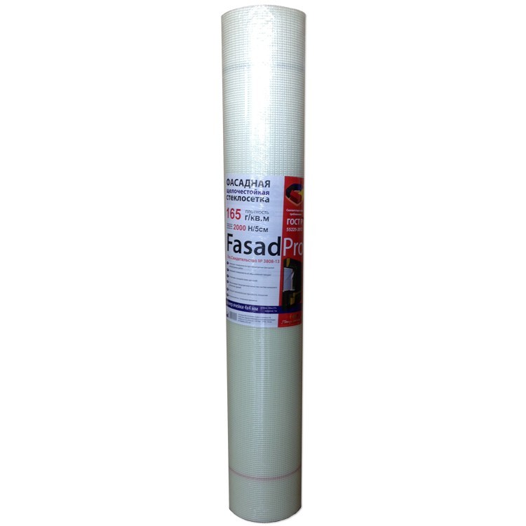 Стеклосетка FasadPro производится из стеклянных нитей и ровингов перевивочным переплетением с размером ячеек 4-6 мм и шириной 10-110см. Сетка имеет высокую прочность на разрыв. Применение сетки малярной фасадной предотвращает возможное появление трещин на штукатурных поверхностях даже при наличии деформаций, связанных с сезонными температурными колебаниями, а также из-за усадки свежепостроенных сооружений. Применение фасадная стеклосетки FasadPro: для армирования штукатурных фасадов; для защиты поверхности от образования трещин; для армирования мест соединения оконных и дверных коробок к стенам; для системы внешнего утепления; для армирования самовыравнивающихся полов. Основные характеристики стеклосетки FasadPro: Плотность - 165 г/м2. Разрывные нагрузки, н/5см: основа - 2000, уток - 2000. Техническое Свидетельство №3808-13. ГОСТ Р 55225-2012 "Сетки из стекловолокна фасадные армирующие щелочестойкие. Технические условия".