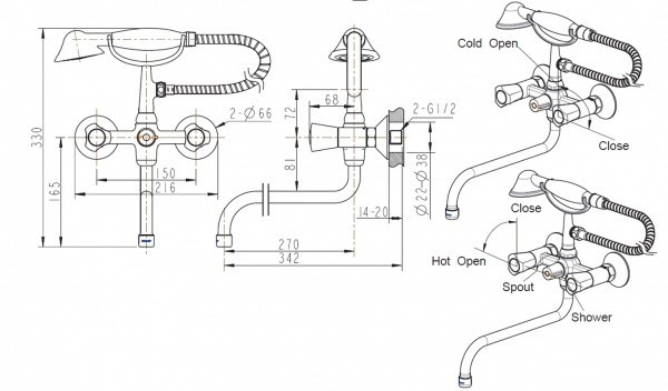 Управление - двухвентильное. Крепление - на стену. Длина излива - 270 мм. Механизм - rерамическая кран-букса |