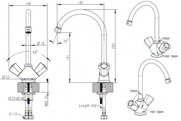 Управление - двухвентильное. Крепление - на мойку. Длина излива - 182 мм. Дополнительные функции: Экономия расхода воды. Механизм - rерамическая кран-букса |