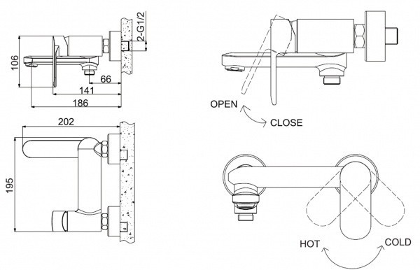 Управление - однорычажное. Крепление - на стену. Длина излива - 186 мм. Механизм - керамический картридж |