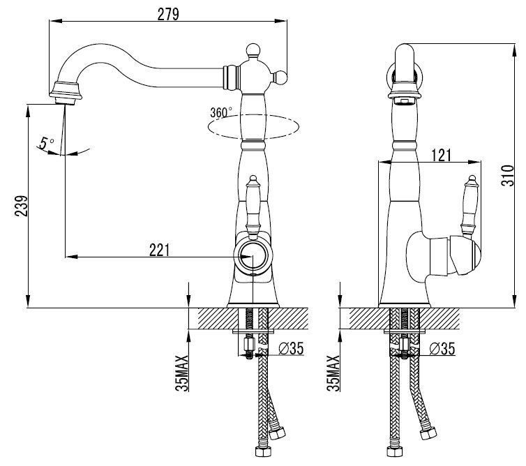 Управление - однорычажное. Крепление - на мойку. Длина излива - 221 мм. Механизм - керамический картридж |