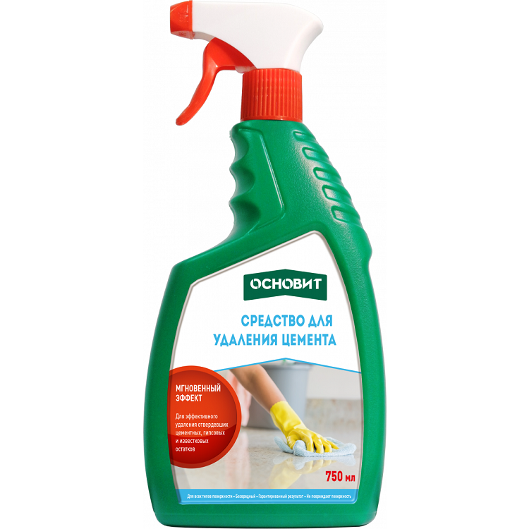 Средство для удаления цемента Основит Сейфскрин SGL1 предназначено для быстрого и легкого очищения затвердевшего бетона, цемента, гипсовых и известковых растворов, штукатурок, полимерных шпаклевок, плиточных клеев, затирок, ВД красок и высолов с любого типа поверхности, в том числе со строительного инструмента. Особенно рекомендуется использовать после проведения ремонтных и строительных работ. Рекомендуемые основания: бетон, цементные и гипсовые материалы, водно-дисперсионные материалы, металлические и пластиковые. Преимущества Основит Сейфскрин SGL1: для всех типов поверхности; не вымывает цвет; легко очищает 5 м2 поверхности; безвредный; гарантированный результат; не повреждает поверхность. Рекомендации по применению. Очищение поверхности можно начинать, когда основание готово к проведению последующих работ или эксплуатации, согласно рекомендации производителя материалов, используемых в отделке и строительстве. Перед очищением необходимо проверить действие смывки на небольшом загрязнённом участке. Наносить очиститель следует локально только на загрязненные участки поверхности, держа флакон с распылителем на расстоянии 15-20 см. Через 5-10 минут обработанную поверхность обильно промыть большим количеством воды, используя жесткую щетку или шпатель. Недостаток промывки или ненадлежащая промывка обработанной поверхности может привести к повреждению очищаемой декоративной поверхности. При необходимости повторить процедуру. Внимание! Очиститель разрушает цемент и гипс: не допускать попадания очистителя на поверхности, не требующие очищения. Не применять при температуре ниже +5оС. Не допускать длительного взаимодействия смывки с очищаемой поверхностью. Пренебрежительное применение смывки может стать причиной необратимых повреждений основания. Меры предосторожности. Хранить в защищенном от детей месте. При попадании раствора в глаза и на кожу тщательно промыть большим количеством воды и обратиться к врачу.