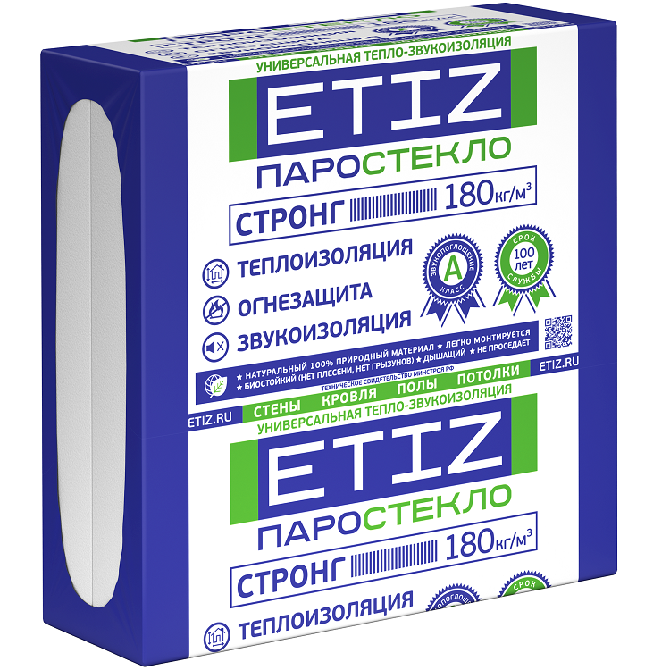 Теплоизоляция ETIZ Паростекло Стронг 180 значительно отличается по физико-механическим свойствам от существующих материалов на рынке тепло-звукоизоляции. Представляет собой твёрдый пористый материал на основе жидкого стекла, пенообразователя и катализатора отверждения, получаемый путём механического вспенивания в миксере с последующей разливкой по формам, в которых происходит отверждение. Теплоизоляционный материал Паростекло ETIZ был разработан российскими учеными (Патент Российской Федерации № 2455252). В отличие от обычного пеностекла, получаемого спеканием смеси стеклобоя при высоких температурах, паростекло ETIZ является продуктом вспенивания силикатного стекла. Вспенивание «жидкого стекла» происходит при участии раствора пенообразователя. Последующее отверждение происходит при относительно низких температурах, около 27-40°С в результате удаления воды и увеличения вязкости раствора. Помимо уникального состава, ноу-хау паростекла ETIZ® заключается в стабилизаторе, который позволяет контролировать время химической реакции от пенообразного состояния до жесткой пористой структуры. По своим характеристикам и структуре паростекло ETIZ® напоминает прочную и легкую яичную скорлупу, которая дышит и одновременно является идеальной защитой для жизни внутри помещения, предохраняя от перепадов температур и шума. Наружная поверхность материала состоит из множества открытых ячеек, поэтому паростекло легко и прочно клеится мастиками, соединяется цементным раствором, штукатурится. Жесткость и безусадочность паростекла позволяют использовать этот материал для теплоизоляции кровель, при создании обогреваемого пола, тротуаров, автостоянок и др. Использование паростекла в строительстве позволяет создавать энергосберегающие строения значительно легче обычных, при общем удешевлении строительства. Материал плотностью 180 кг/м³ отлично подходит для отделки фасада; наружных и каркасных стен, пола над холодным подвалом, теплоизоляции эксплуатируемой кровли и перекрытий между этажами, мансард, бань и каминов. Преимущества теплоизоляции ETIZ Паростекло: Экологичность. Плиты ETIZ – это фактически природный материал, основой которого является кварцевый песок. Материал не содержит и не выделяет вредных химических веществ, в процессе эксплуатации экологически безопасен. Огнестойкость. Материал является негорючим – класс пожарной опасности строительного материала КМ0. Плиты паростекла ETIZ могут нециклично применяться при температурах до +750 °С. Только при температуре выше 1100 ⁰С ETIZ начинает оплавляться, при этом не выделяет дыма, запаха и прочих вредных веществ, опасных для человека. Звукоизоляция. Благодаря открытой пористой структуре паростекло отражает воздушные звуки (распространяющиеся в воздухе), а также поглощает ударные, благодаря чему ETIZ имеет непревзойденные звукоизоляционные характеристики. Низкая теплопроводность. Низкий коэффициент теплопроводности паростекла позволяет создать комфортные условия внутри помещения, сохраняя тепло зимой и прохладу летом. В отличие от других изоляционных материалов на стыках плит ETIZ не образуются «мостики холода». Прочность и устойчивость к деформации. Особая структура Паростекла ETIZ, похожая по своим характеристикам на яичную скорлупу, обеспечивает высокую сопротивляемость мех