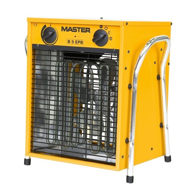 Тепловая пушка электрическая Master B 9 EPB обеспечит быстрый и интенсивный обогрев помещения любого целевого назначения площадью до 90 м2. Такой аппарат работает в трех режимах и при нагреве не распространяет посторонних запахов. Температуру нагрева можно задать при помощи встроенного термостата. Используемый нагревательный ТЭН изготовлен из нержавеющей стали. Тепловая пушка оснащена термореле - для защиты от перегрева. Двигатель вентилятора изолирован от нагревательного элемента теплоизоляционным кожухом, что позволяет работать прибору длительное время без излишней тепловой нагрузки на двигатель. Рационально разработанная конструкция обеспечивает высокую степень теплопередачи, в результате чего КПД прибора близко к 100% а сам тепловентилятор может длительное время работать непрерывно, не перегреваясь и не разрушаясь. Двухстороннее расположение рукояток обеспечивает более удобную транспортировку и возможность направить поток горячего воздуха в нужную сторону. Защитная решетка на передней панели выполняет не только декоративную функцию, но и предотвращает попадание внутрь прибора посторонних предметов, могущих повлечь заклинивание двигателя или возгорание вследствие перегрева. Малый вес и компактные размеры обеспечивают легкость монтажа и перемещения прибора. Назначение тепловой пушки Master B 9 EPB: Закрытые помещения. Сельское хозяйство, строительство, станции технического обслуживания, магазины, жилые помещения, офисы, погреба, складские помещения. Рекомендуются при проведении малярных, штукатурных работ, во время укладки паркета и работ сантехников. Для эффективного удаления влаги из помещения используется вместе с осушителями воздуха компании. Режимы: Выключение. Вентилятор. 1 степень нагревания. 2 степень нагревания. Преимущества тепловой пушки Master B 9 EPB: Мгновенный нагрев. Не сжигают кислород. Низкий уровень шума. Отсутствие дыма, запаха и конденсата. КПД 100 %. Защита электродвигателя от перегрева. Нагревательные элементы из нержавеющей стали. Электрические нагреватели с вентиляторами. оснащены термостатом перегрева. Встроенный комнатный термостат. Прочная конструкция с большим сроком службы.