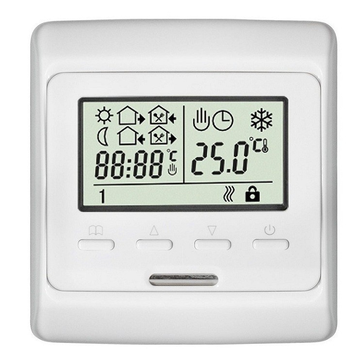 Терморегулятор Menred E 51.716 предназначен для ручной и автоматической регулировки температуры в помещениях, обогреваемых кабельными, инфракрасными и другими электрическими системами обогрева. Особенности терморегулятора Menred E 51.716: Постоянное поддержание комфортной температуры. Суточный цикл распределения комфортной температуры по времени. Пользователь задает временные интервалы в течение суток, когда ему необходим теплый пол. Прибор настраивается на помещение, определяет его тепловые характеристики и сам определяет время включения с таким расчетом, чтобы достигнуть комфортной установленной температуры строго в установленное время. Все остальное время обогрев выключен, что позволяет экономить электроэнергию. Программа исполняется с суточным циклом. Недельный цикл. Полностью аналогично варианту «2», только цикл равен 1 неделе с произвольным программированием для каждого дня недели. Состав комплекта: терморегулятор; датчик температуры пола; паспорт, инструкция по установке и использованию; крепежные винты.