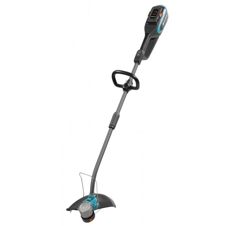 Аккумуляторный триммер Gardena PowerCut Li-40/30 09827 – мощный и простой в эксплуатации инструмент, работающий от аккумулятора 40 Вольт, который поможет Вам избавиться от высокой травы или сорняков возле частных домов и в саду. Триммер отличается высоким крутящим моментом, небольшим весом, удобством в использовании, надежным валом и наличием ECO-режима. Преимущества триммера Gardena PowerCut Li-40/30 09827: Высокая мощность благодаря 40В литий-ионному аккумулятору. Сменный аккумулятор емкостью 2600 мАч характеризуется постоянной подачей высокой мощности, неприхотливостью в обслуживании, возможностью частой зарядки и простой замены. Также на самом аккумуляторе отображается уровень заряда аккумулятора. Триммер Gardena PowerCut Li-40/30 может работать и от аккумулятора 4200 Ач емкостью, тогда продолжительность работы будет дольше. Постоянный высокий крутящий момент благодаря бесщеточному двигателю Gardena PowerPlus, который отличается эффективностью и долгим сроком службы без частого техобслуживания. Управление одним пальцем. Панель управления, включения, выключения, уровень заряда аккумулятора и включения ECO-режима – все находится на видном месте. ECO-режим снижает количество оборотов двигателя, чтобы достичь максимального времени работы аккумуляторной батареи. Благодаря мощному двигателю и надежному валу достигаются максимальные обороты в 8500 об/мин. и в ЕCO-режиме 7500 об/мин. Съемный вал. В этой модели реализован съемный вал, который упрощает транспортировку и позволяет сэкономить место при хранении триммера. Соединить две части так же просто, как и вставить аккумулятор. Полуавтоматическая триммерная головка. На данном аккумуляторном триммере Gardena установлена полуавтоматическая триммерная головка, артикул 5307. Ширина стрижки составляет 30 см, а толщина наматываемой лески максимально может быть 1,6 мм и длина 6 м. Полуавтоматическая подача лески. Ударная технология последовательно обеспечивает подачу лески и работает только при оборотах двигателя. Коротко коснитесь головкой о землю, корд автоматически продлится, а лишняя его часть обрежется об ограничительный нож. Защитный кожух защищает расположенные рядом цветы от повреждения. Также есть сверху установлен ограничитель, который может быть установлен в рабочем положении вниз или вверх для транспортировки или хранения. Эргономичная ручка с мягким охватом и дополнительная D-образная ручка позволяют работать в расслабленном вертикальном положении и легко оперировать инструментом. Так же D-образную ручку можно с легкостью и без инструментов отрегулировать под свой рост.