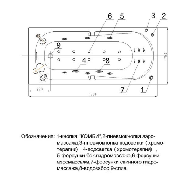 Управление - пневматическое. Зона гидромассажа - Гидромассаж боковой. Количество форсунок для бокового массажа - 6. Количество человек - 1 |