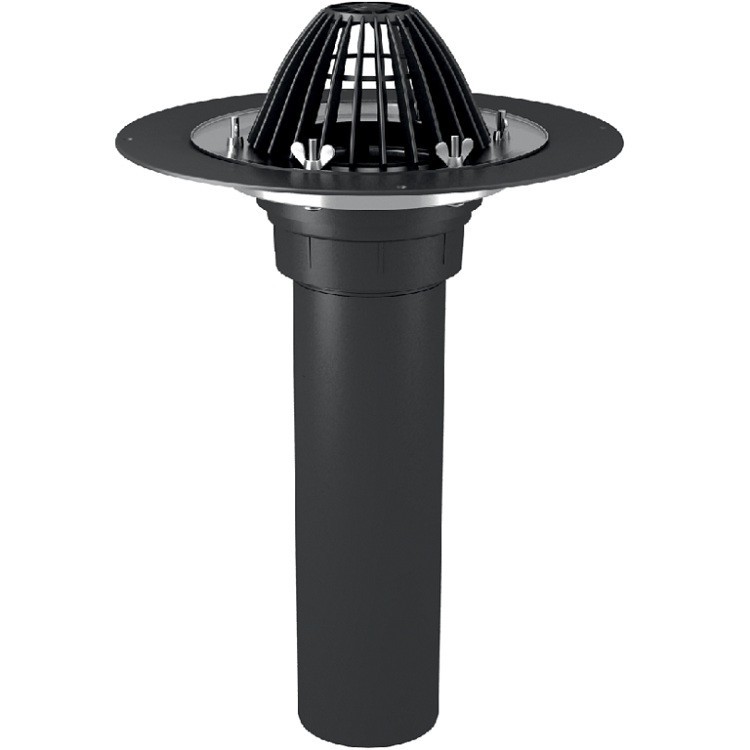 Кровельная воронка Технониколь ВФ с листвоуловителем и обжимным фланцем из нержавеющей стали с вертикальным выпуском используется при устройстве водоотвода с поверхности кровли. Когда водосток с крыши идет в общий канализационный коллектор, устанавливают необогреваемые воронки. Это связано с тем, что в коллекторе постоянно поддерживается положительная температура. Воронка производится из высокопрочного блок-сополимера и пропилена, что позволяет ее использовать во всех климатических поясах России. Дополнительно для защиты от солнца в пластик добавлены УФ-стабилизаторы, обеспечивающие долговечность не менее 25 лет. Благодаря механическому способу соединения кровельного полотна с водоприемной чашей, такая воронка применима для всех типов кровельных материалов. Использование нержавеющего крепежа (гаек и болтов) в конструкции воронки позволяет производить замену кровли без демонтажа элементов водоприемной системы. Материал кровельного ковра надежно фиксируется между прижимным фланцем из нержавеющей стали и пластиковой чашей нержавеющим болтом с гайкой. Для того, чтобы избежать повреждения пластиковой чаши при чрезмерном затягивании гайки нижняя часть воронки усилена стальным фланцем из оцинкованной стали. Преимущества: совместима со всеми видами кровельных рулонных материалов; комплектуется листвоуловителем; способствуют продолжительному сроку службы кровли.