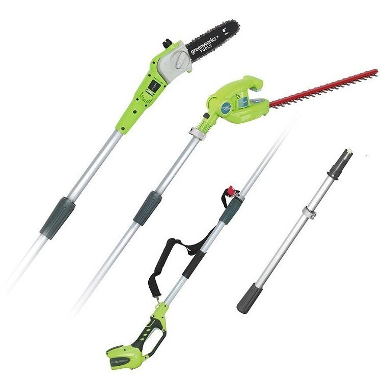 Аккумуляторный высоторез Greenworks G40PSH имеет сменные модули кустореза и сучкореза для ухода за вашим садом на высоте! Этот высоторез позволяет выполнять любые работы, связанные с обрезкой деревьев или высоких кустарников за счет сменных модулей: кустореза, сучкореза и модуля удлинения. Кусторез легко справится с формированием крон деревьев, стрижкой и подрезкой кустарника, живой изгороди и других декоративных растений. Семипозиционное лезвие позволяет стричь растения под разным углом. Длина лезвия с алмазной заточкой 51 см, шаг среза 18 мм. Сучкорез с шиной 20 и цепью Oregon позволяет обрезать высокие ветки и сучья. Удлинитель позволяет увеличить высоту работы высотореза до 4 метров. Высоторез-сучкорез работает от аккумуляторной батареи Greenworks 40V, которая также совместима с более 15 моделями садовой аккумуляторной техники Greenworks линейки 40V. Особенности аккумуляторного высотореза Greenworks 40V: 2 в 1: два самых популярных инструментов объединены в один для легкой работы с высокими кустами и деревьями. Два инструмента – кусторез и высоторез на одной базе меняются без ключей. Сучкорез – длина пилы 20 см. Кусторез – длина лезвия 51 см, шаг среза 18 мм, 7-позиционная поворотная головка для обрезки под всеми углами. Высота работы до 4 метров. Гарантия 2 года. Аккумуляторная батарея и зарядное устройства не входят в комплект и приобретаются отдельно.