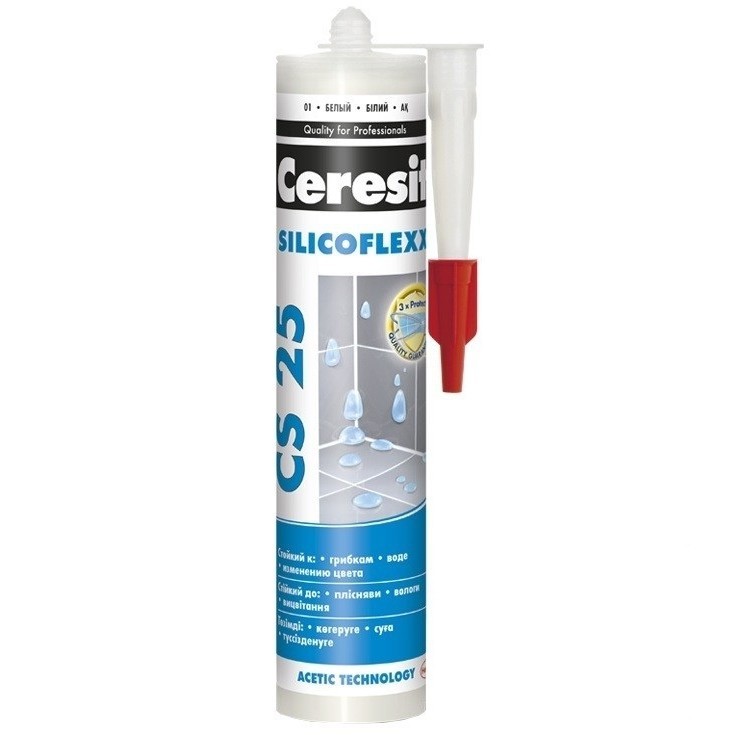 Затирка-герметик силиконовая Ceresit CS 25 белая - затирка с усиленным противогрибковым эффектом для герметизации угловых швов и стыков. Предназначена для герметизации угловых, деформационных и примыкающих к санитарно-техническому оборудованию (ваннам, раковинам и др.) швов плиточных облицовок в помещениях с повышенной влажностью: ванных комнатах, душевых, кухнях, туалетах и т.д. Обладает высокой адгезией к эмалированным поверхностям, стеклу, фарфору и фаянсу. Благодаря высокой стойкости к температурным перепадам, ультрафиолетовому излучению и озону затирка Ceresit CS 25 может применяться для герметизации швов наружных облицовок. Благодаря высокой эластичности затирка Ceresit CS 25 эффективна при герметизации швов, подверженных деформациям, там, где обычные затирки, как правило, растрескиваются. Не имеет адгезии к резине, битуму, гудрону, тефлону, полиэтилену и материалам, выделяющим масла, пластификаторы или растворители. Содержит фунгициды и при отверждении выделяет уксусную кислоту, поэтому не пригодна для контакта с пищевыми продуктами, питьевой водой, мрамором, известняком, зеркалами, корродирующими металлами (свинцом, медью, цинком, железом) и герметизации аквариумов. При помощи пистолета-нагнетателя равномерно выдавливают затирку CS 25, полностью заполняя шов. Не позднее 15 минут после заполнения шов смачивают мыльной водой и заглаживают влажным шпателем, убирая излишек затирки. Малярную ленту удаляют сразу после заглаживания шва. Толщина слоя затирки должна составлять примерно 1/2 ширины шва. Свежую затирку можно удалить спиртом или ацетоном, затвердевшую – только механически. Преимущества силиконовой затирки-герметика Ceresit CS 25: эластичная; водостойкая; длительный противогрибковый эффект «TrioProtection»; устойчива к температурным перепадам; атмосферостойкая, обладает высокой стойкостью к УФ-излучению и озону; пригодна для наружных и внутренних работ; легко наносится; экологически безопасна. Рекомендации: Работы по заполнению швов с затиркой Ceresit Ceresit CS 25 проводятся при температуре основания и окружающего воздуха в пределах +5-+30°C, относительная влажность не должна превышать 80%. До полного отвердения шовного заполнителя, поверхность необходимо защитить от загрязнений. Особенно внимательно нужно применять силиконовые затирки на поверхностях матовых керамических и клинкерных плиток, попадание даже незначительного количества силикона на их поверхность может быть непоправимо. А применение силиконовой затирки для обработки швов мозаичных листов практически невозможно.