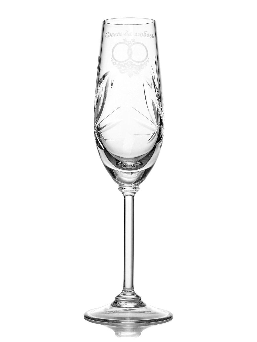 Классический хрусталь ручной работы. Набор из 2-х свадебных бокалов 160 мл с гравировкой \"Совет да любовь\". Изящная форма изделия, резка, особый хрустальный звон и игра света - вот что делает хрусталь прекрасным дополнением к любому празднику и подарком. Напиток не изменит температуру (не нагреется от руки) благодаря очень низкой теплопроводности хрусталя. Набор упакован в подарочную картонную коробку.
