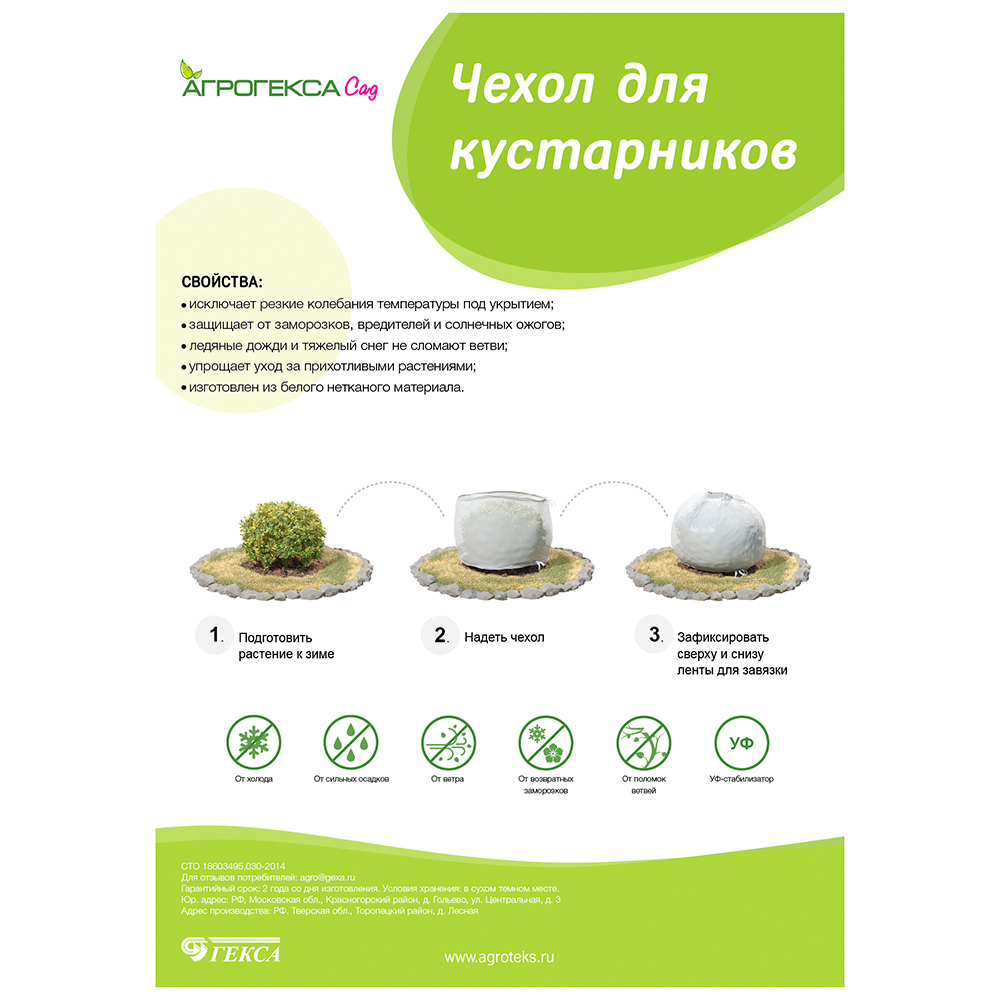 Защитный нетканый материал предназначен для укрытия декоративных кустарников, саженцев плодовых деревьев высотой до 1,5 м. Преимущества: - защищает от заморозков; - ранних оттепелей; - резких колебаний температуры; - насекомых и механических повреждений. При ранней оттепели продлевает естественный покой растения, предотвращая их от солнечных ожогов. Ультрафиолетовый стабилизатор защищает от вредных солнечных лучей и увеличивает срок годности материала до трех сезонов.