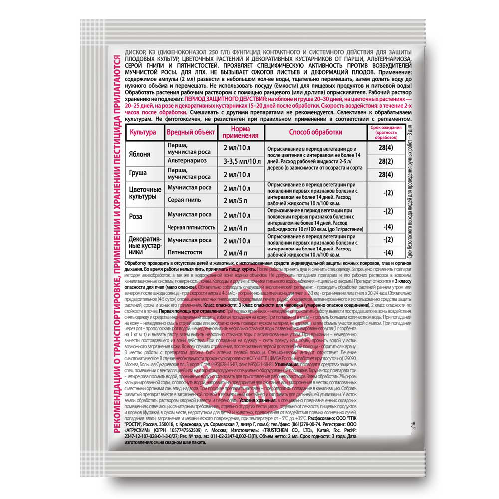 Фунгицидный препарат Дискор - для защиты декоративных и плодовых деревьев и кустарников от парши, альтернариоза, мучнистой росы, плодовых гнилей, черной пятнистости, черной и серой гнили и т.д. Фунгицид действует системно и контактно не только на плодах, но и на листьях. Обладает лечебным и защитным действием. Повышает урожайность культур и их качество. Препятствует развитию заболеваний при хранении плодов. Не вызывает ожогов листьев и деформаций плодов. Средство быстро поглощается растением (в течение 2-х часов после обработки), не смывается дождем, не фитотоксично. Период защитного действия: на яблоне и груше 20-30 дней, на цветочных растениях - 20-25 дней, на розе и декоративных кустарниках 15-20 дней после обработки. Применение: Опрыскивать растения рекомендуется в утренние и вечерние часы, в сухую, безветренную погоду, равномерно смачивая листья и ветки. Рабочий раствор использовать в день приготовления. Состав: 250 г/л дифеноконазола.