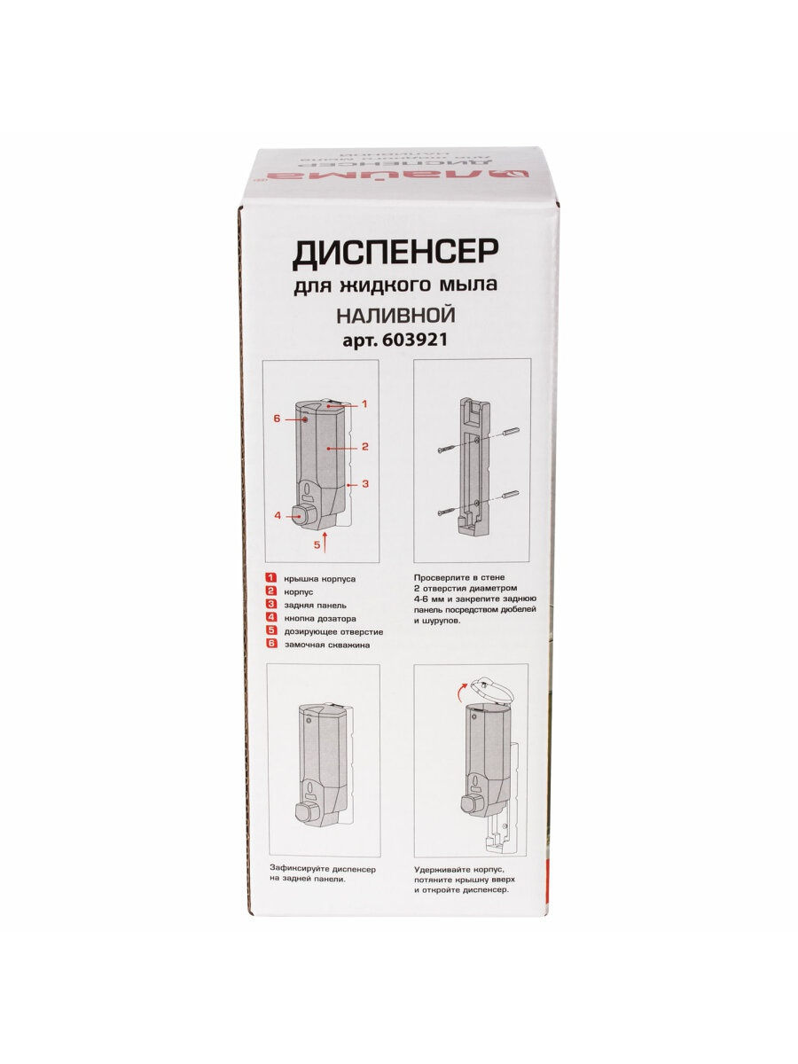 Предназначен для экономичного дозирования жидкого мыла в туалетных комнатах любой проходимости. Благодаря особой конструкции прост в эксплуатации. Максимально отвечает требованиям гигиены. Изготовлен из ударопрочного пластика. Объем: 0.38 л. Тип диспенсера: наливной для жидкого мыла. Артикул: 603921. Система: нет. Управление: механическое. Тип закрывания: пластиковый ключ. Индикаторы: окно для контроля уровня мыла. Комплектация: крепежные материалы. Количество режимов дозирования: 1. Сочетается с расходными материалами других производителей: да. Материал замка: пластик. Материал корпуса: ударопрочный пластик ABS. Цвет корпуса: белый-синий. Ширина: 85 мм. Высота: 200 мм. Глубина: 95 мм. Артикул производителя: 603921.