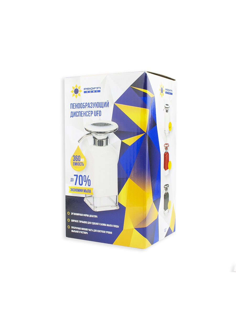 Кто-то до сих пор пользуются обычным кусковым мылом, некоторые отдают предпочтение жидкому мылу в диспенсерах, а мы предлагаем Вам следующий эволюционный шаг - стильный пенообразующий диспенсер UFO! Несравненное удобство и ощутимая экономия мыла (до 70% по сравнению с обычными дозаторами). Диспенсер активируется легким нажатием на его верхнюю часть, после чего мыло выливается через носик-трубочку. Дно диспенсера прозрачное, что позволяет следить за количеством мыла внутри. Пенообразующий диспенсер UFO превращает ваше любимое мыло в богатую пену. Заполните диспенсер: 60% водой (220 мл), 20% мылом (70 мл) и 20% оставьте для воздуха - для создания пены. Перед первым применением необходимо хорошо встряхнуть диспенсер, для образования мыльного раствора. Преимущества: до 70% экономии мыла; эргономичная форма дозатора; широкое горлышко для удобного залива мыла и воды; прозрачная нижняя часть для контроля уровня мыльного раствора.