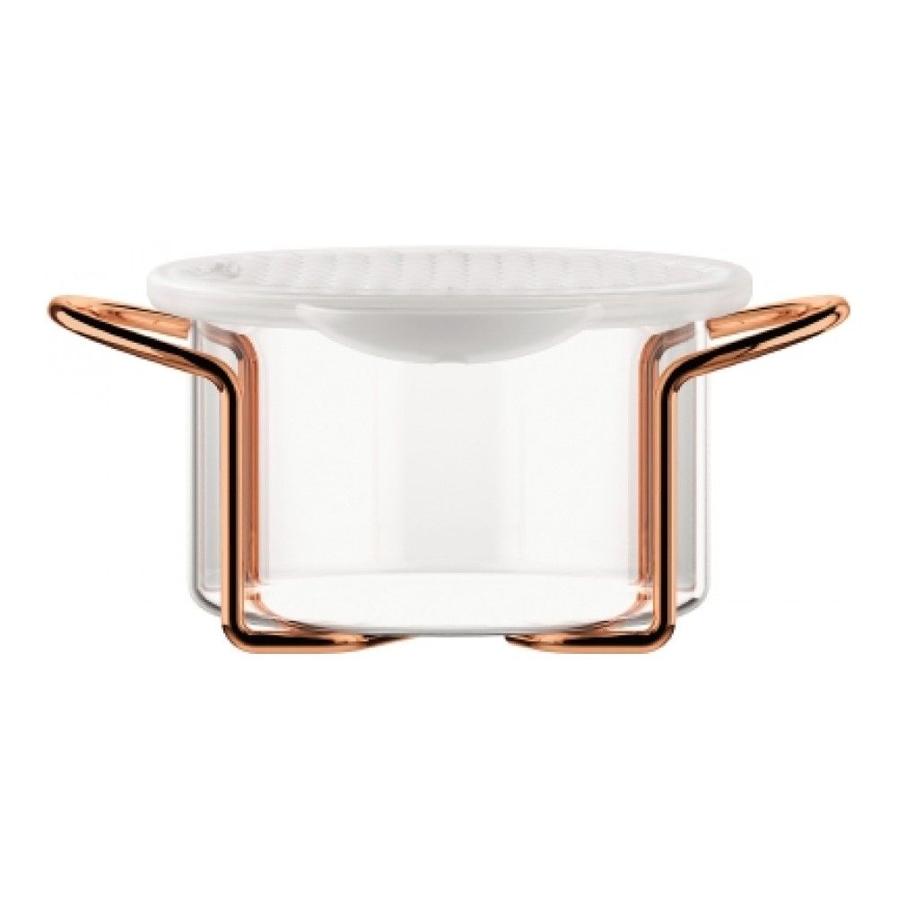 Эта стеклянная емкость е входит в редкую серию предметов BODUM в оправах медного цвета. Вся серия и эта емкость в частности, выдержана в стилистике легкого ретро. Медные серии встречаются у BODUM не часто, тиражи таких предметов невелики. Металлические оправы несут не только декоративную функцию, они предохраняют стеклянные колбы от случайных ударов. Сама же колба сделана не из обычного стекла, а боросиликатного. Оно выглядит более глянцевым, чем обычное, кроме того оно не тускнеет со временем. Боросиликатное стекло е мутнеет и не царапается, сколько бы вы его ни мыли.